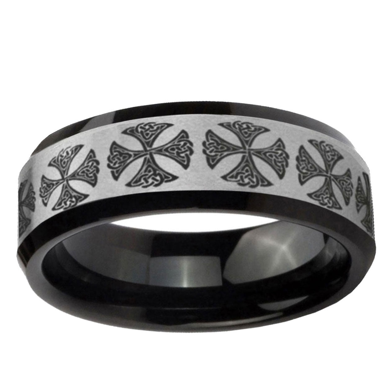Intruding 5, 8mm Medieval Cross Beveled Brush Black 2 Tone Tungsten Wedding Engraving Ring . Offer in both 5mm and 8mm band width brush black 2 tone finished from size 4 to 14