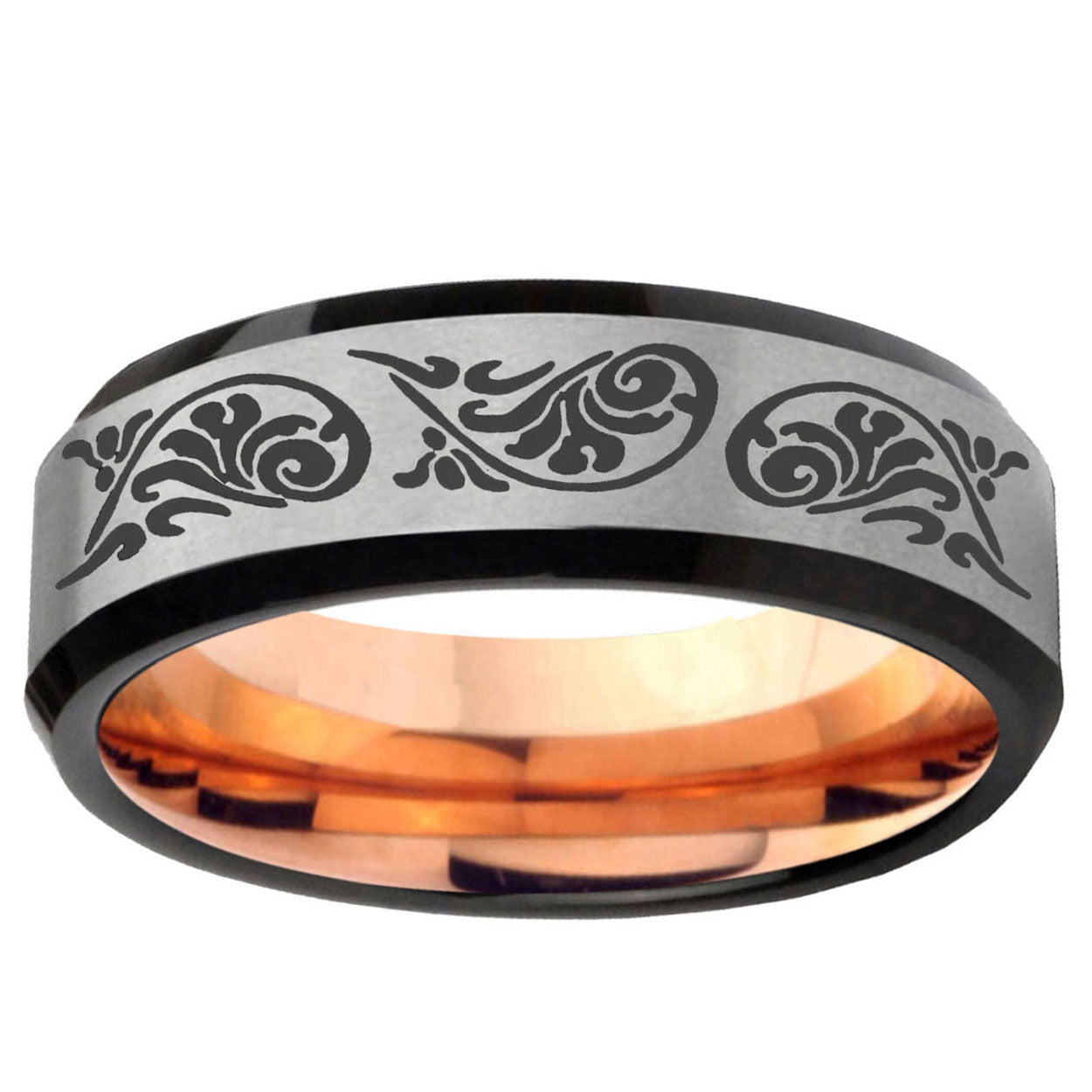 Intruding 6, 8mm Etched Tribal Pattern Beveled Edge Gray And Rose Gold Tungsten Mens Ring . Offer in both 6mm and 8mm band width gray and rose gold finished from Size 5 to 14
