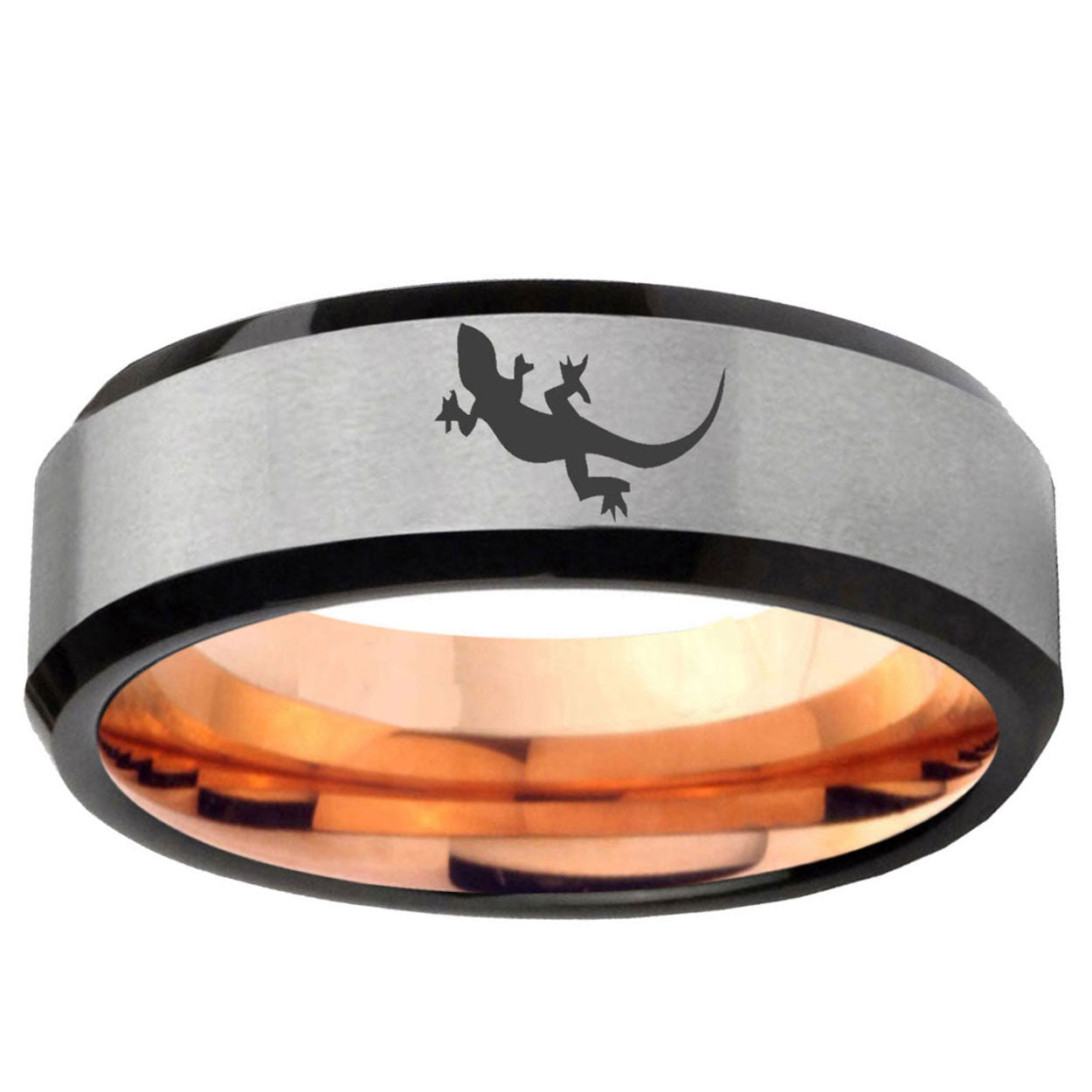 Intruding 6, 8mm Lizard Beveled Edge Gray And Rose Gold Tungsten Carbide Wedding Bands Ring . Offer in both 6mm and 8mm band width gray and rose gold finished from Size 5 to 14