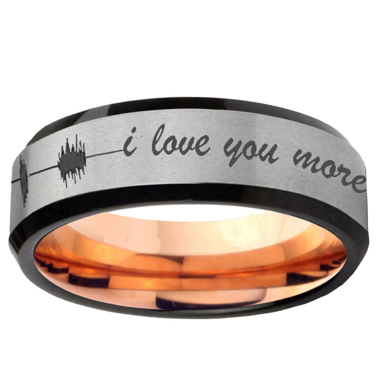 Intruding 6, 8mm Sound Wave I love you more Beveled Gray And Rose Gold Tungsten Men's Ring . Offer in both 6mm and 8mm band width gray and rose gold finished from Size 5 to 14
