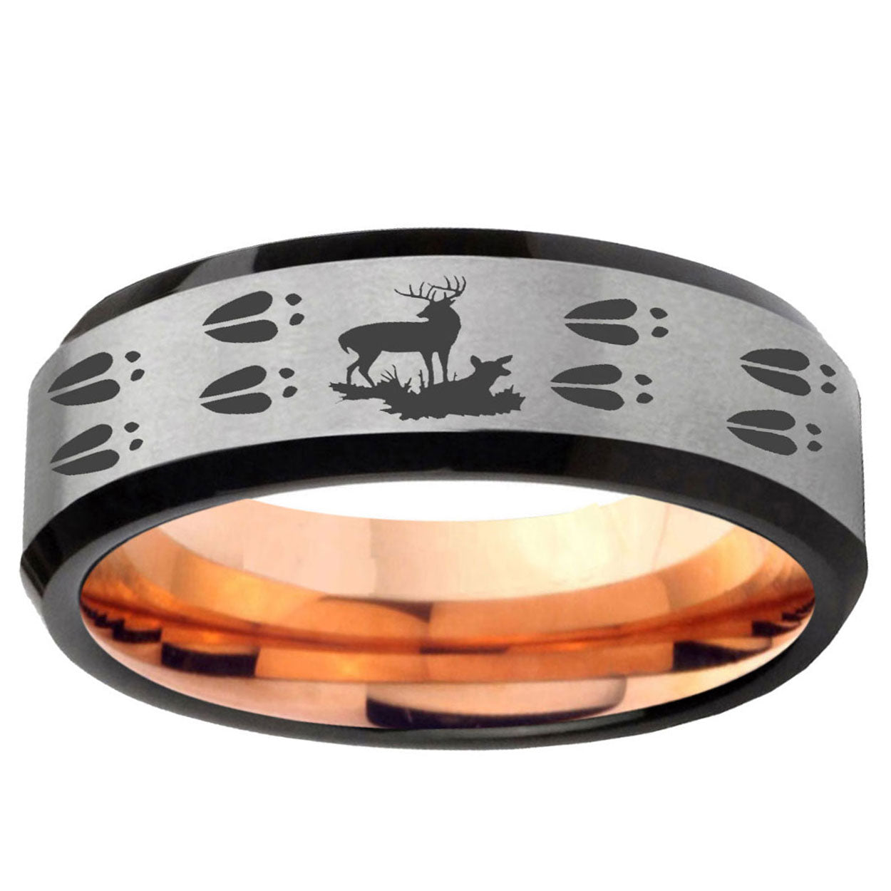 Intruding 6, 8mm Deer Hunting Tracks Beveled Gray And Rose Gold Tungsten Mens Engagement Ring . Offer in both 6mm and 8mm band width gray and rose gold finished from Size 5 to 14