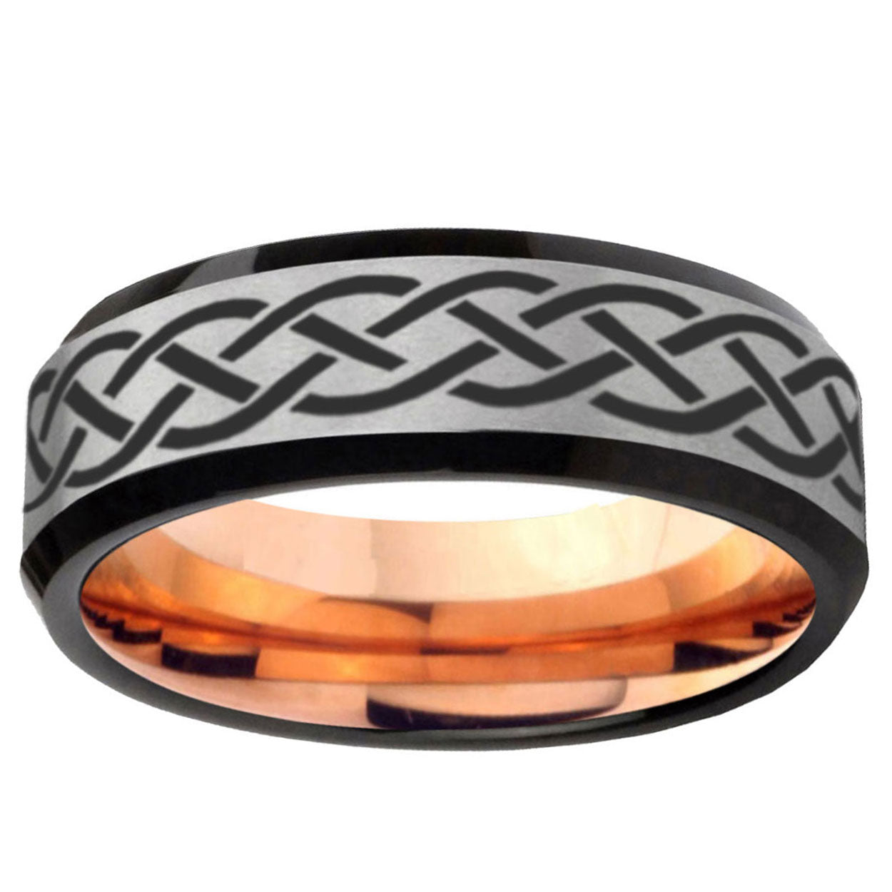 Intruding 6, 8mm Celtic Knot Beveled Gray And Rose Gold Tungsten Wedding Engraving Ring . Offer in both 6mm and 8mm band width gray and rose gold finished from Size 5 to 14