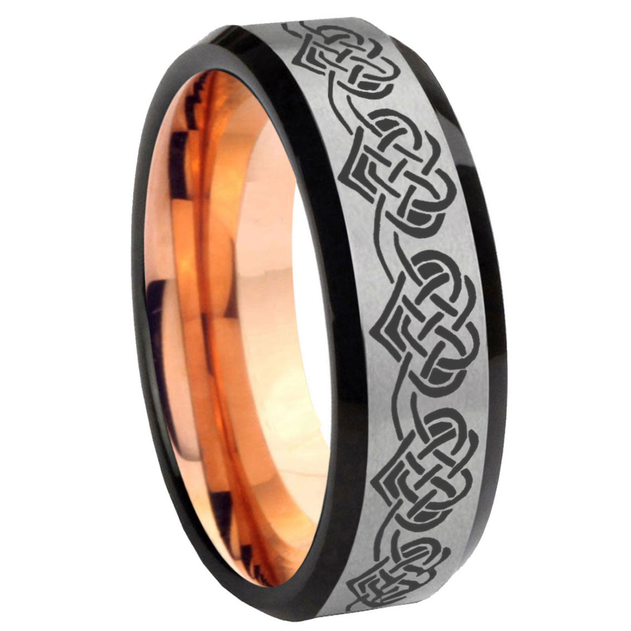 Intruding 6, 8mm Celtic Knot Heart Beveled Gray And Rose Gold Tungsten Wedding Engraving Ring . Offer in both 6mm and 8mm band width gray and rose gold finished from Size 5 to 14