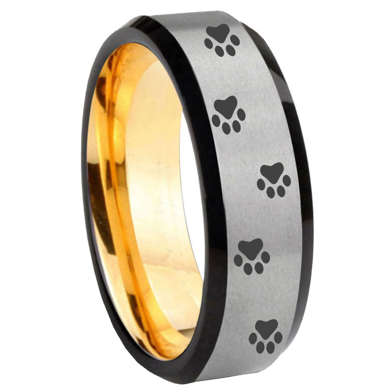 8mm Paw Print Beveled Tungsten Carbide Silver Gold Mens Engagement Ring
