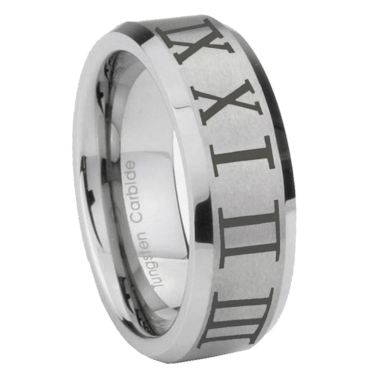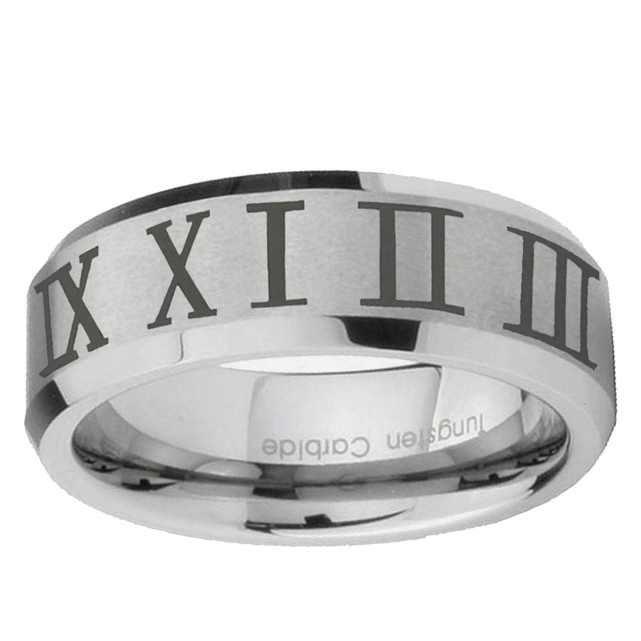 Introducing 6, 8mm Roman Numeral Beveled Edge Brushed Grey Tungsten Mens Engagement Band . Offer in both 6mm and 8mm band width brushed grey finished from size 5 to 14