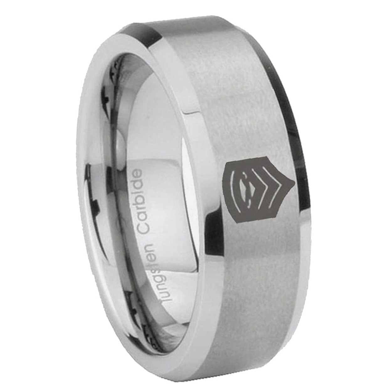 Introducing 6, 8mm Army Sergeant Major Beveled Edge Brushed Grey Tungsten Mens Anniversary Ring . Offer in both 6mm and 8mm band width brushed grey finished from size 5 to 14
