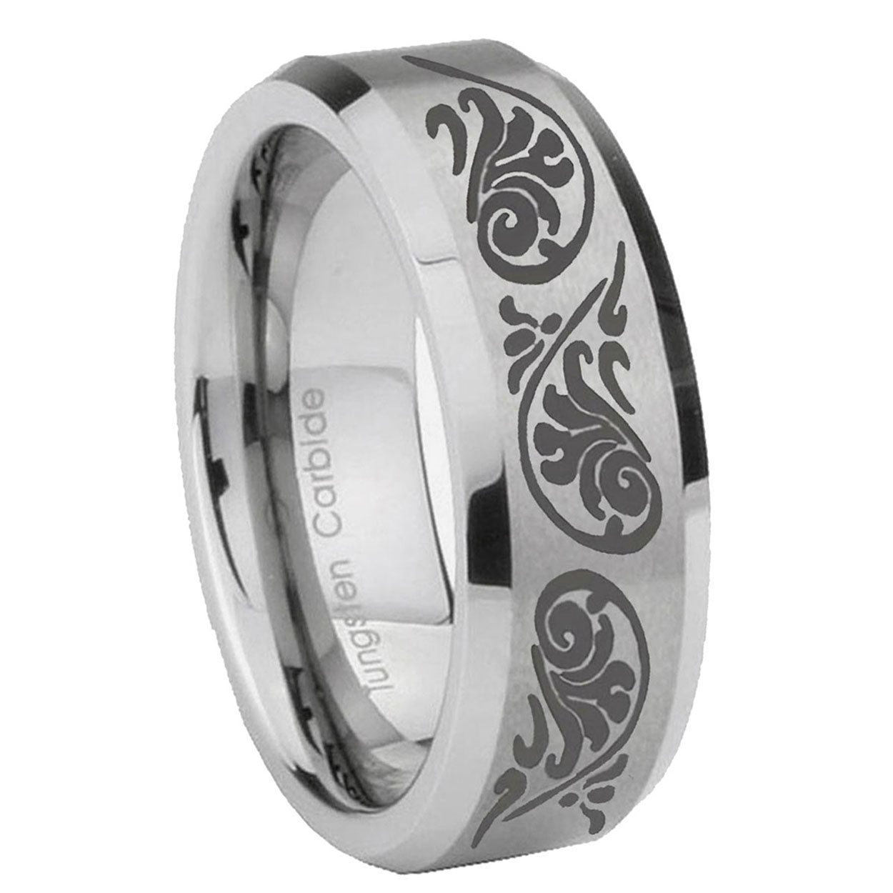 Introducing 6, 8mm Etched Tribal Pattern Beveled Edge Brushed Grey Tungsten Mens Ring Personalized . Offer in both 6mm and 8mm band width brushed grey finished from size 5 to 14