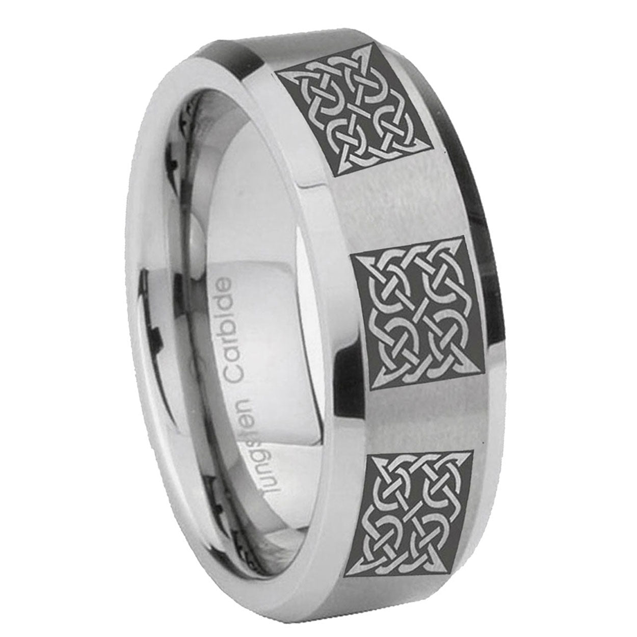 Intruding 6, 8mm Multiple Celtic Beveled Edges Brushed Gray Tungsten Wedding Engraving Ring . Offer in both 6mm and 8mm band width polished Brushed Gray finished from size 5 to 14