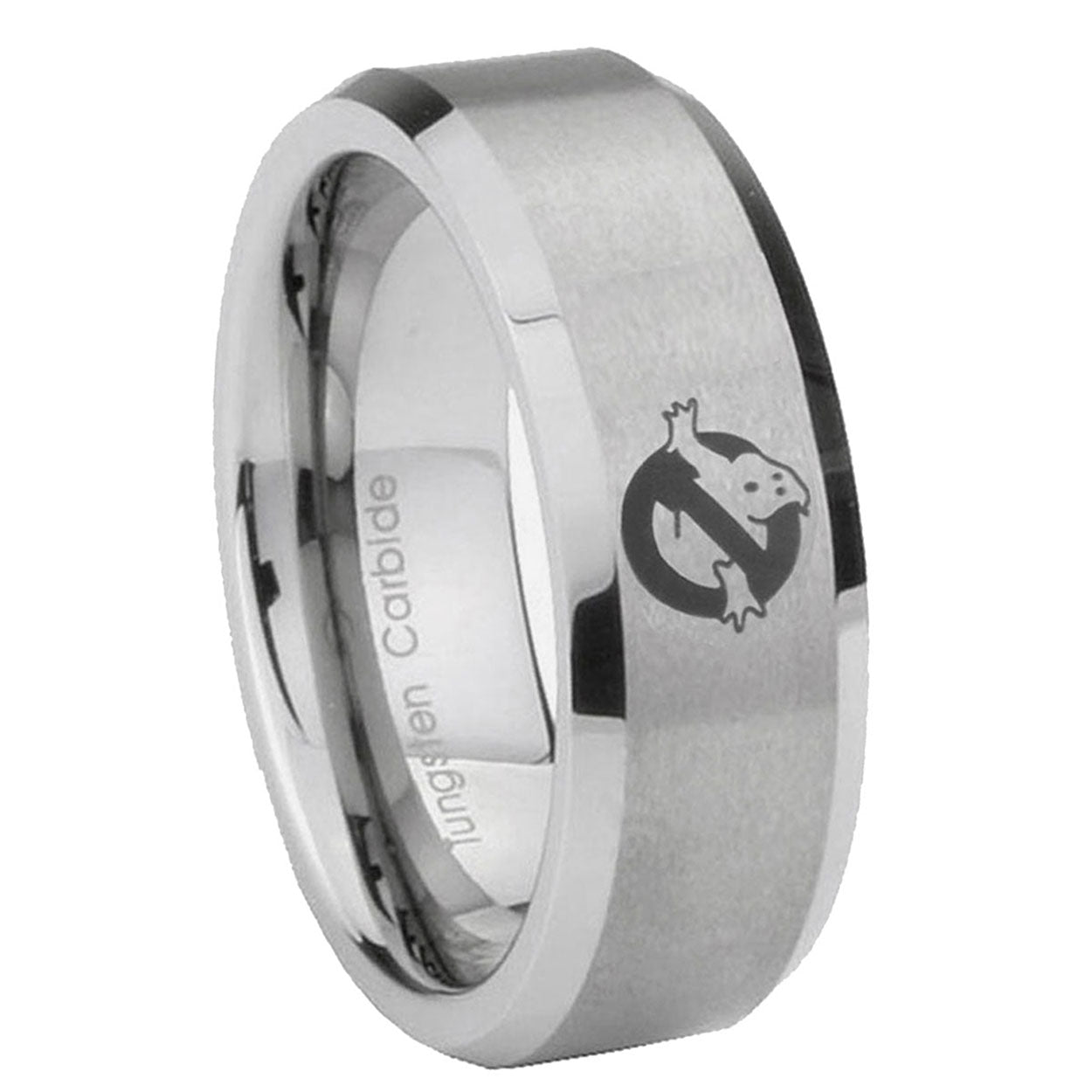Introducing 6, 8mm Ghostbusters Beveled Edge Brushed Grey Tungsten Anniversary Ring . Offer in both 6mm and 8mm band width brushed grey finished from size 5 to 14