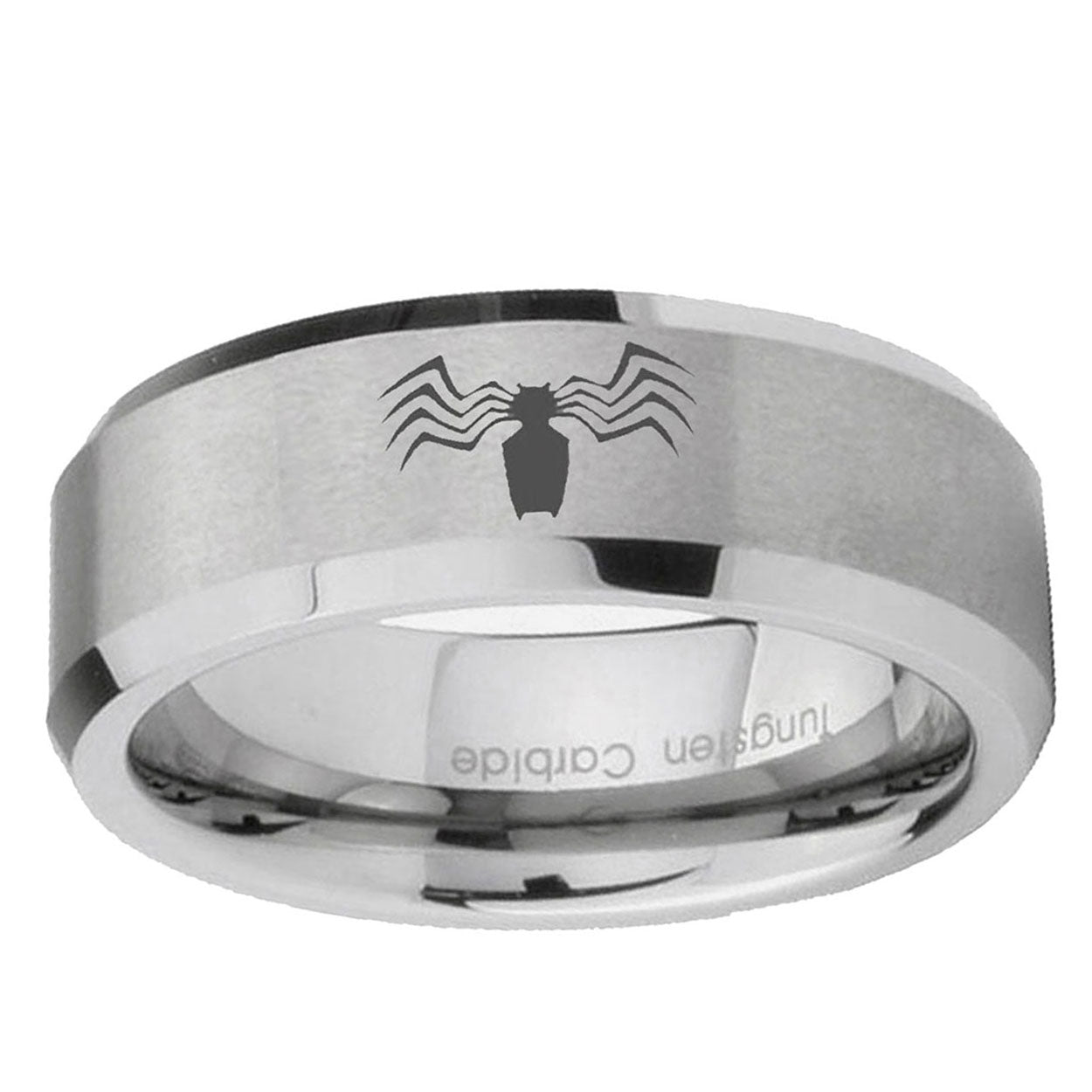 Introducing 6, 8mm Spider Beveled Edge Brushed Grey Tungsten Engraved Ring . Offer in both 6mm and 8mm band width brushed grey finished from size 5 to 14