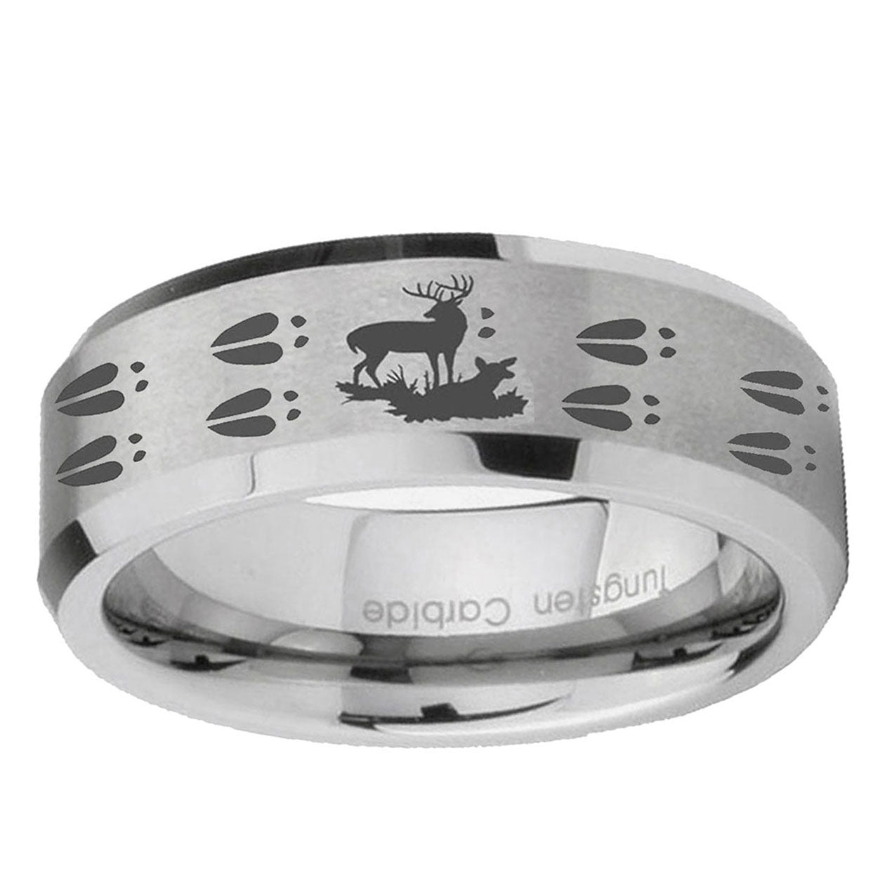Introducing 6, 8mm Deer Hunting Tracks Beveled Edge Brushed Grey Tungsten Men's Ring . Offer in both 6mm and 8mm band width brushed grey finished from size 5 to 14