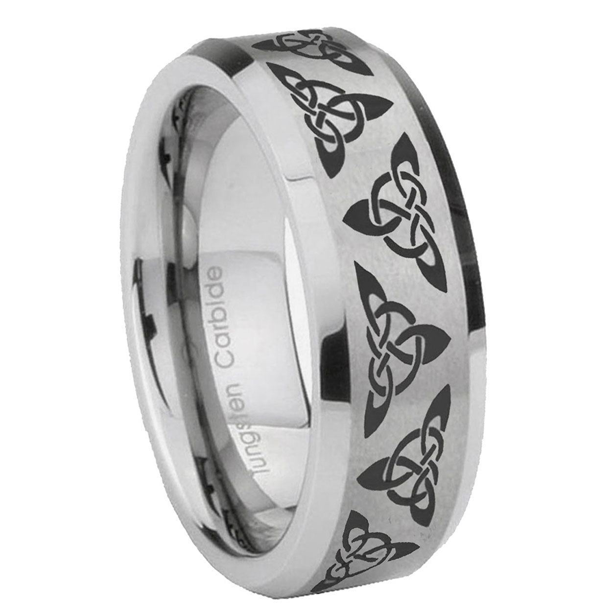 Intruding 6, 8mm Celtic Knot Beveled Edges Brushed Gray Tungsten Wedding Engagement Ring . Offer in both 6mm and 8mm band width polished Brushed Gray finished from size 5 to 14