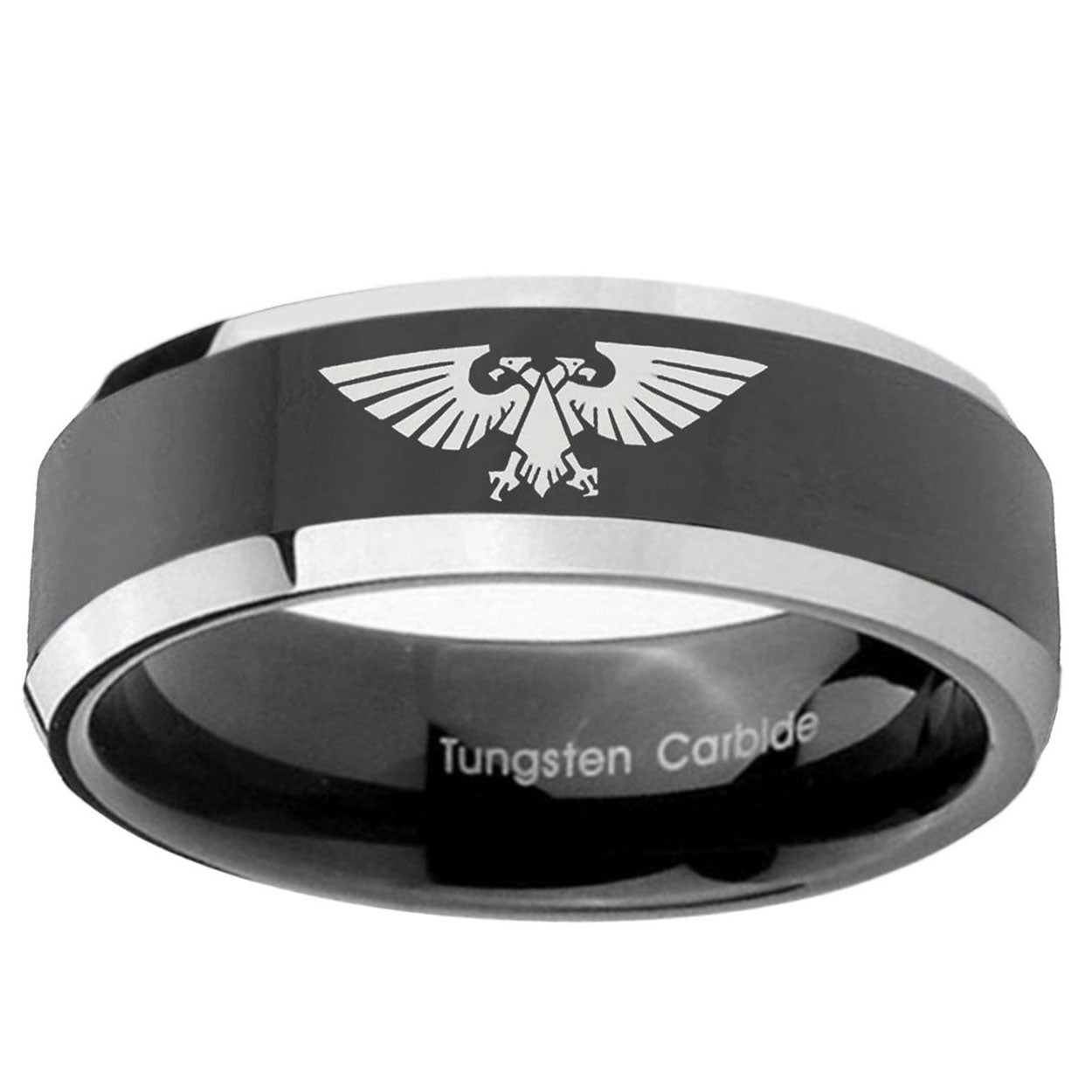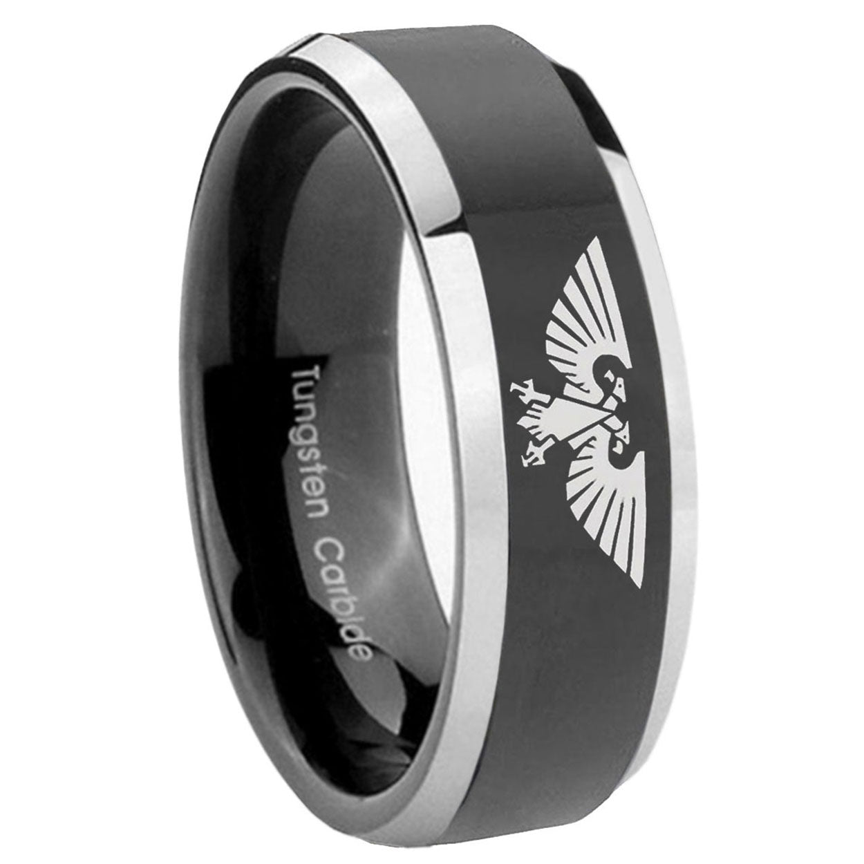 Intruding 5, 8mm Aquila Beveled Edges Glossy Black 2 Tone Tungsten Mens Engagement Ring . Offer in both 5mm and 8mm band width shiny black pated two tone finished from size 4 to 14