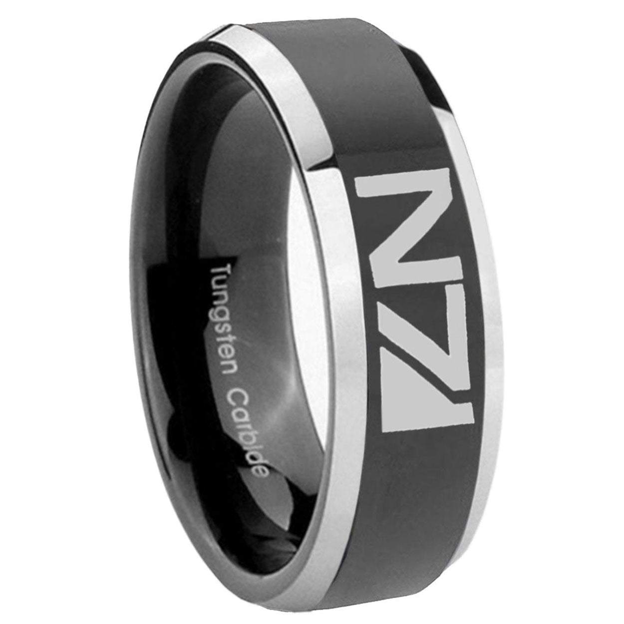 5, 8mm N7 Design Beveled Edges Glossy Black 2 Tone Tungsten Men's Ring