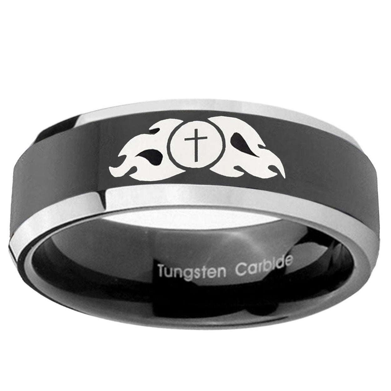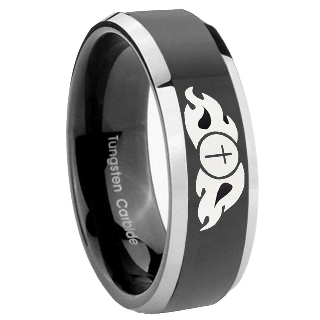 Intruding 5, 8mm Flamed Cross Beveled Edges Glossy Black 2 Tone Tungsten Mens Wedding Ring . Offer in both 5mm and 8mm band width shiny black pated two tone finished from size 4 to 14