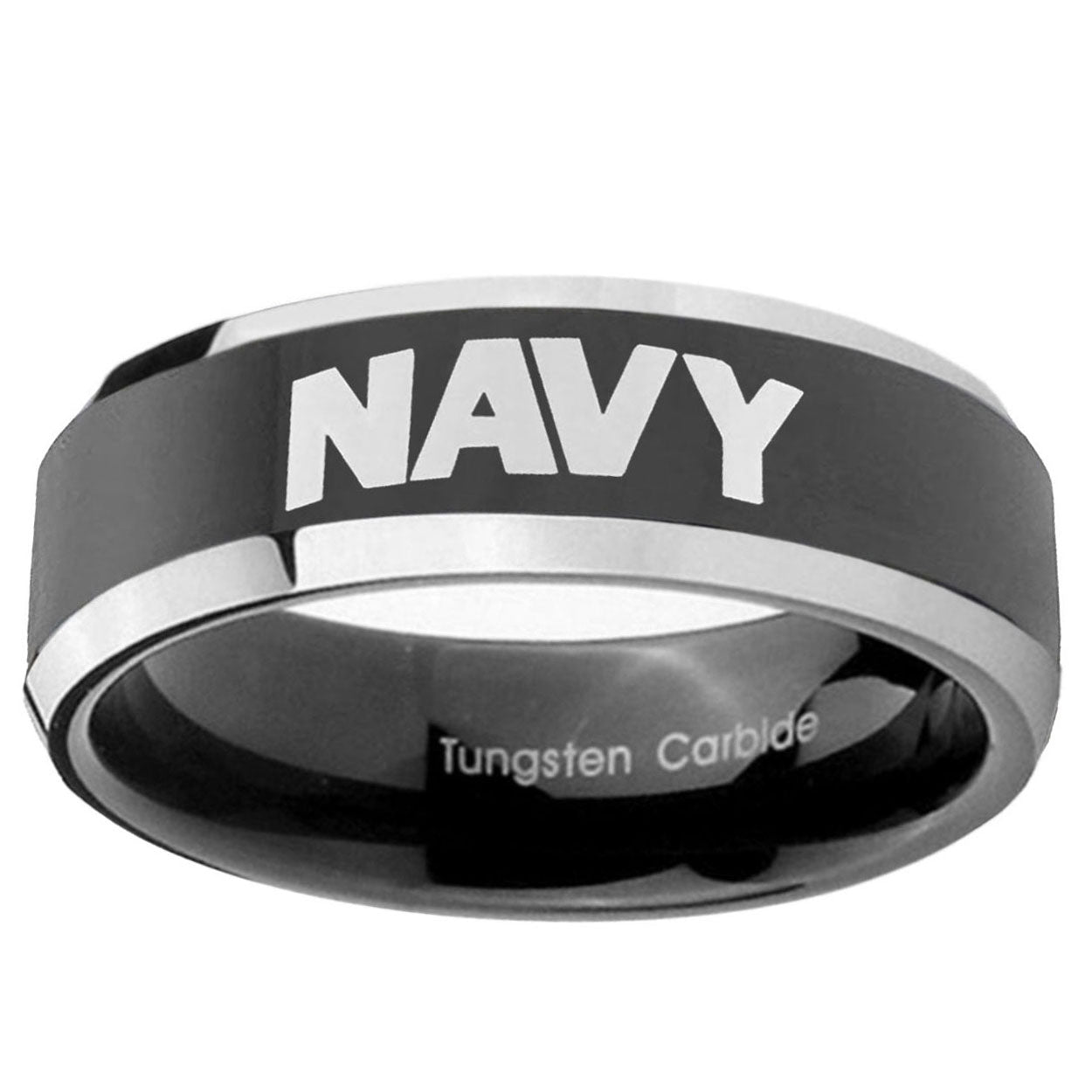 Intruding 5, 8mm Navy Beveled Edges Glossy Black 2 Tone Tungsten Men's Engagement Ring . Offer in both 5mm and 8mm band width shiny black pated two tone finished from size 4 to 14