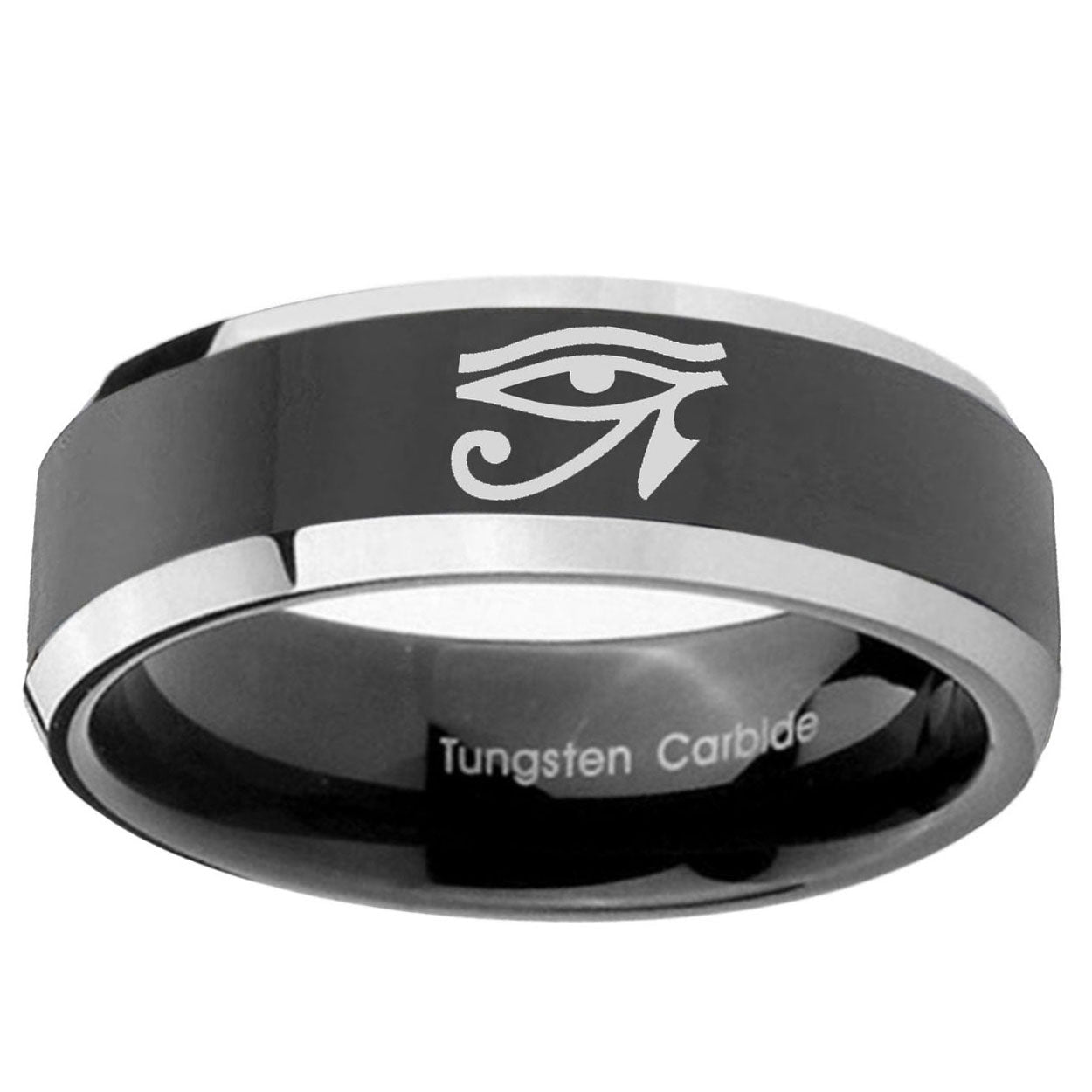5, 8mm Seeing Eye Beveled Edges Glossy Black 2 Tone Tungsten Carbide Engraved Ring