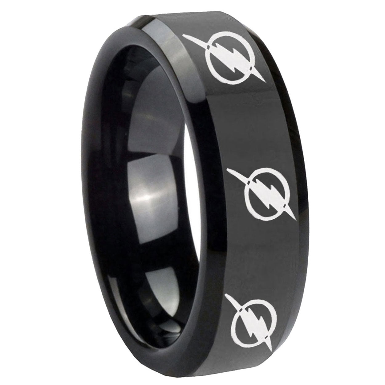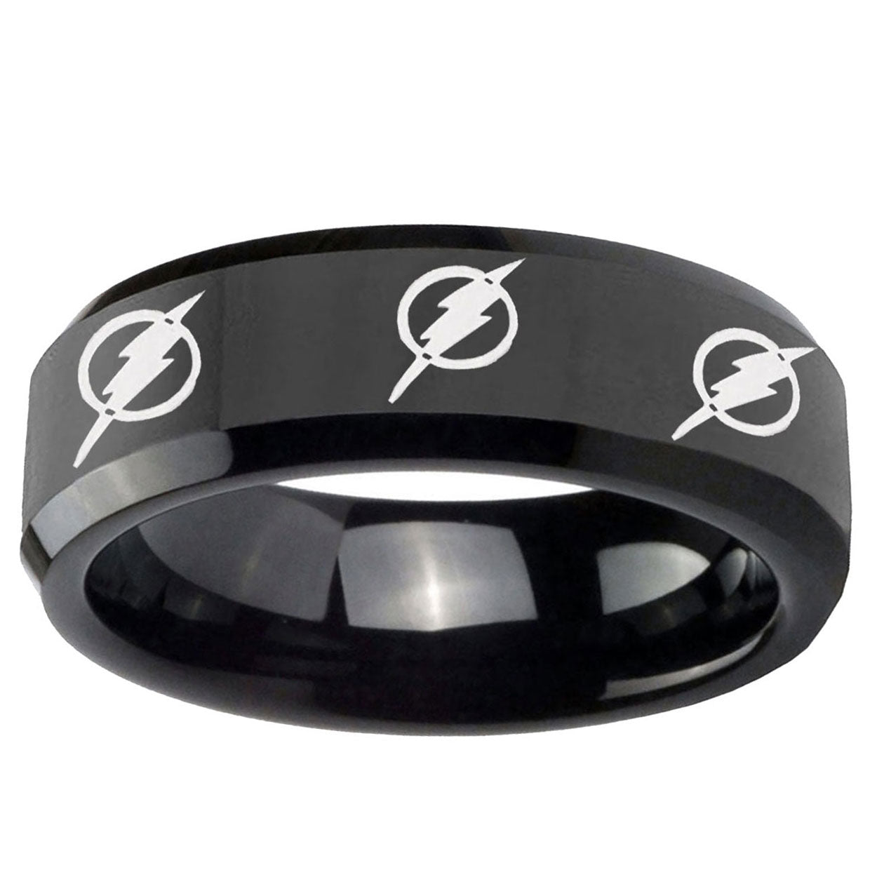 Intruding 5, 8mm Multiple Flash Beveled Edge Polish Black Wedding Tungsten Bands . Offer in both 5mm and 8mm band width polished black plated finished from size 4 to 14