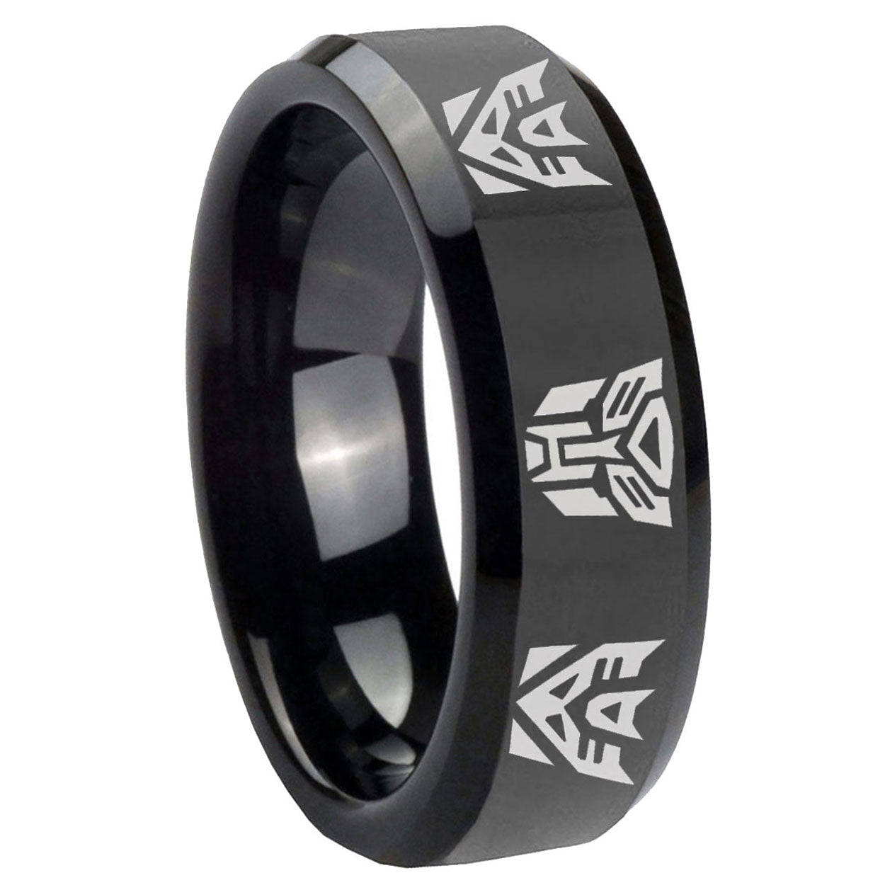 Intruding 5, 8mm Transformers Autobot Decepticon Beveled Edges Black Tungsten Carbide Promise Ring . Offer in both 5mm and 8mm band width polished black plated finished from size 4 to 14