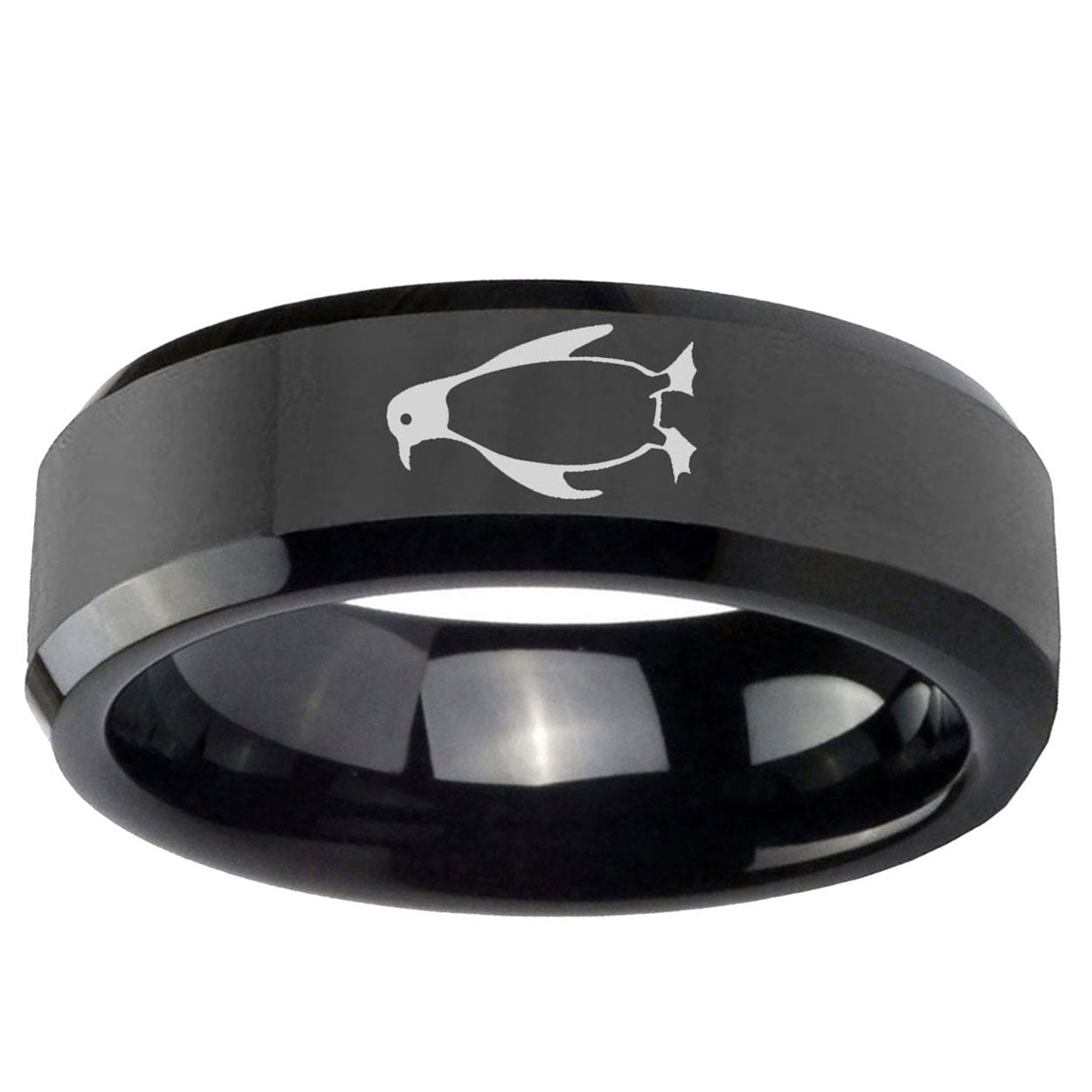 Intruding 5, 8mm Penguin Beveled Edges Black Tungsten Carbide Mens Engagement Band . Offer in both 5mm and 8mm band width polished black plated finished from size 4 to 14