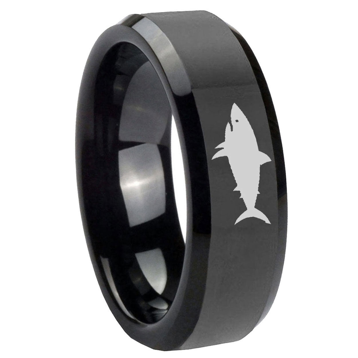 Intruding 5, 8mm Shark Beveled Edges Black Tungsten Carbide Mens Engagement Band . Offer in both 5mm and 8mm band width polished black plated finished from size 4 to 14