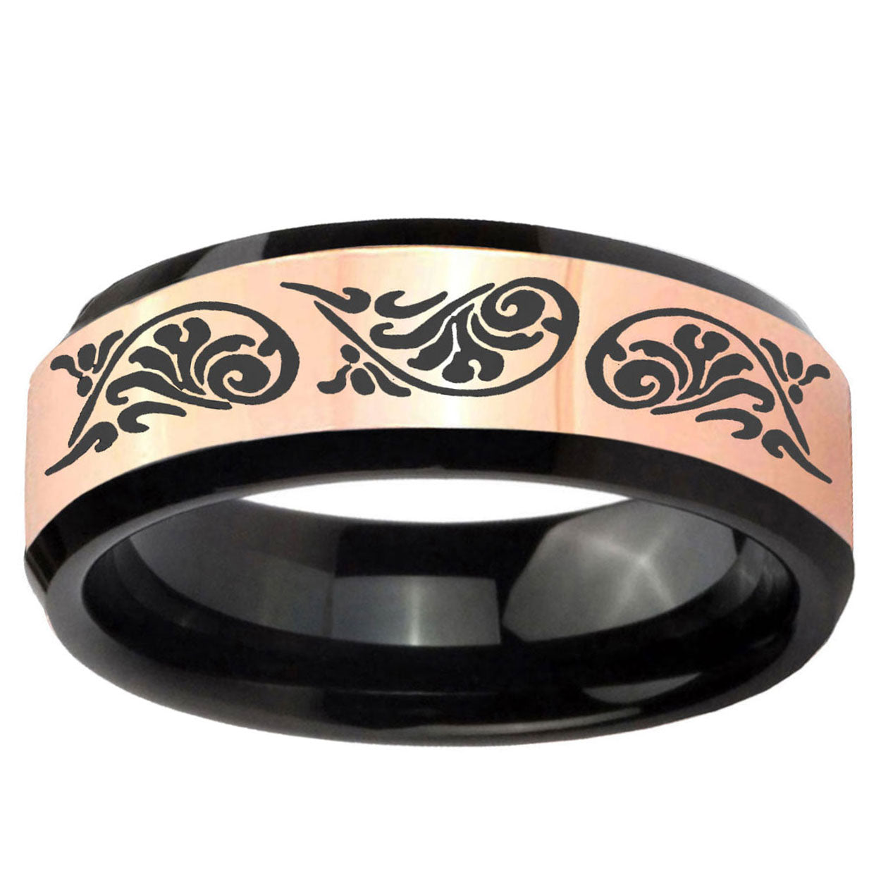 Intruding 8mm Etched Tribal Pattern Rose Gold And Black Beveled Edge Tungsten Mens Ring Personalized . Offer in men wedding band in 8mm band width rose gold black plated finished from size 7 to 14