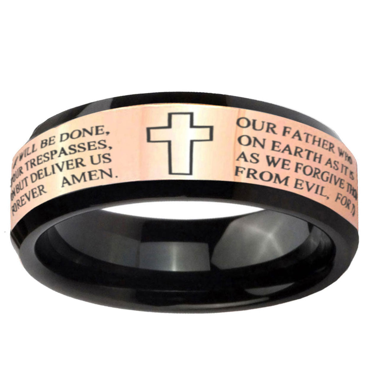 Intruding 8mm Etched Lord's Prayer Cross Rose Gold And Black Beveled Edge Tungsten Carbide Men's Wedding Ring . Offer in men wedding band in 8mm band width rose gold black plated finished from size 7 to 14