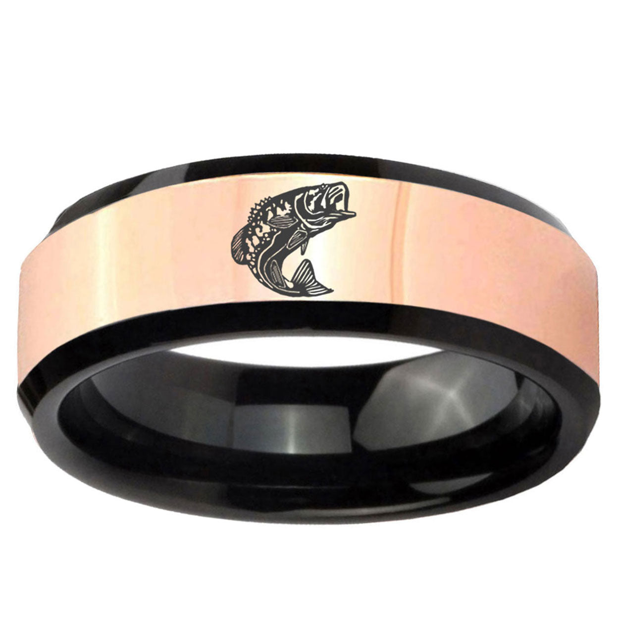Intruding 8mm Fishing Rose Gold And Black Beveled Edge Tungsten Carbide Men's Wedding Ring . Offer in men wedding band in 8mm band width rose gold black plated finished from size 7 to 14