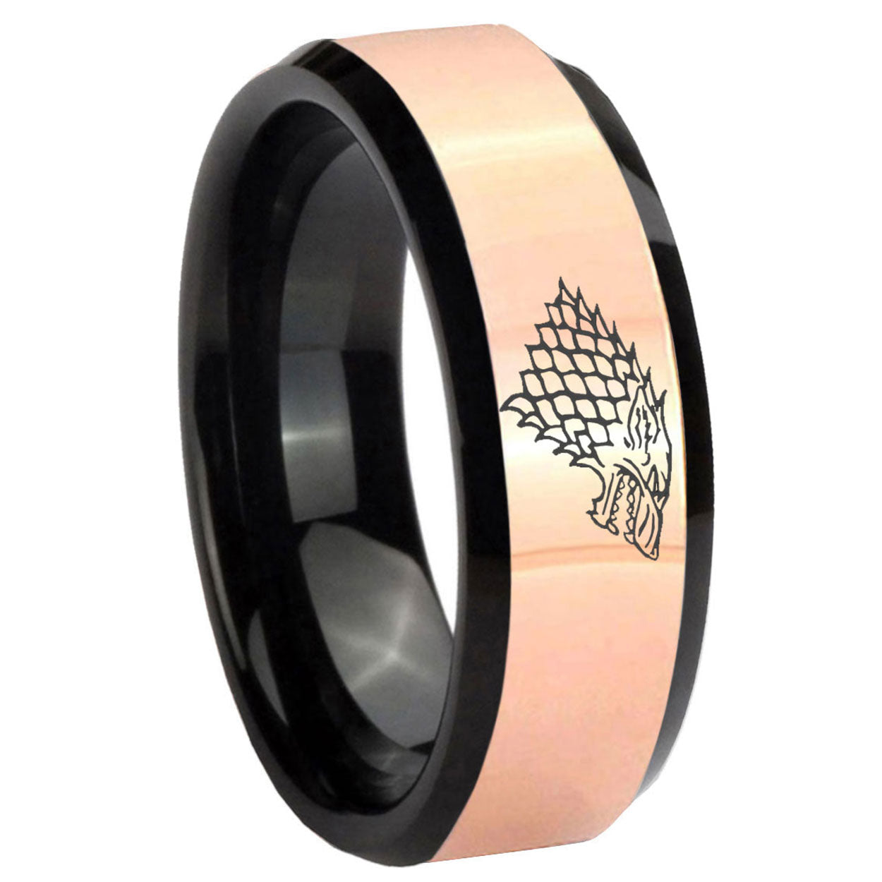 Intruding 8mm Game Of Thrones House Stark Direwolf Rose Gold And Black Beveled Edge Tungsten Carbide Men's Wedding Ring . Offer in men wedding band in 8mm band width rose gold black plated finished from size 7 to 14