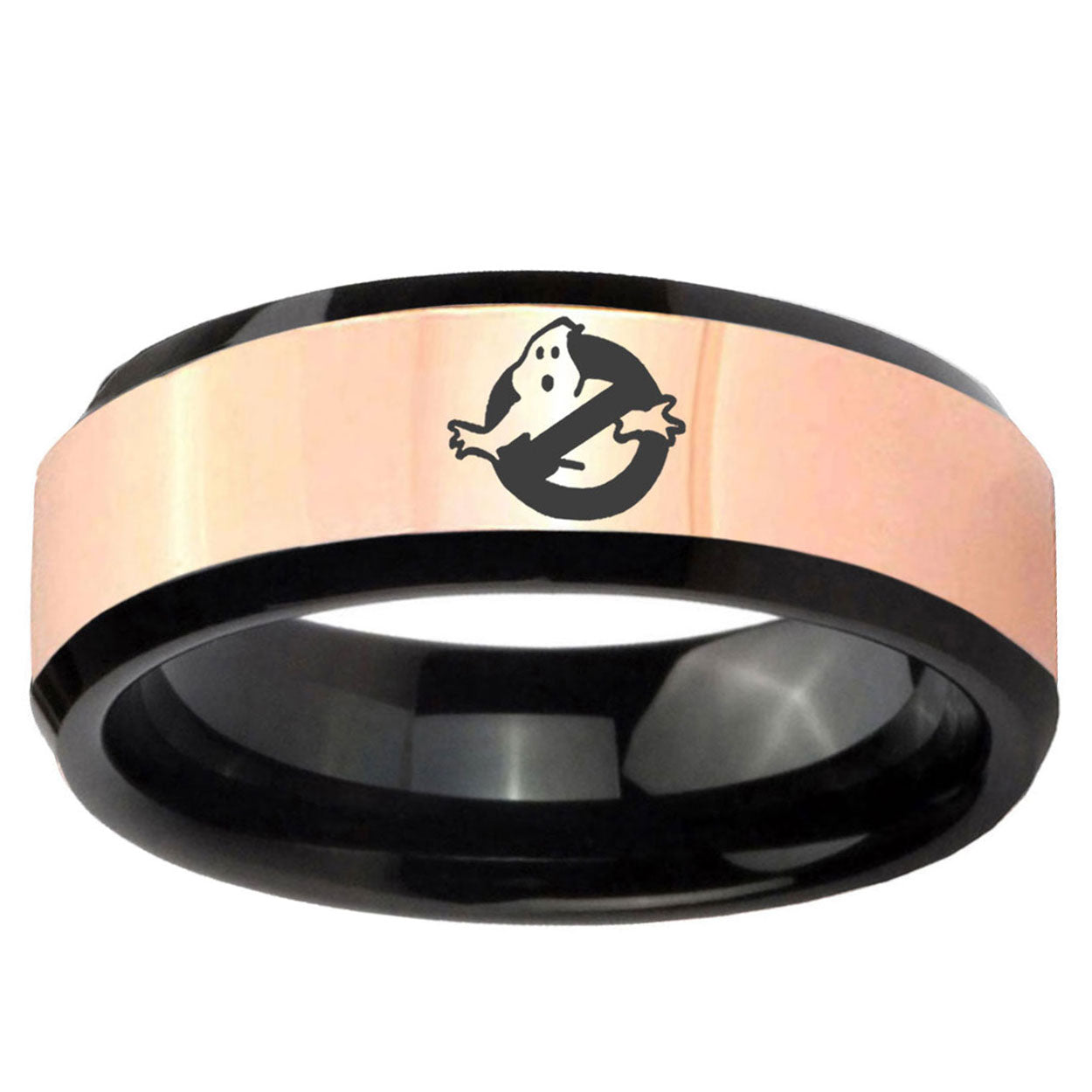 Intruding 8mm Ghostbusters Rose Gold And Black Beveled Edge Tungsten Carbide Wedding Band Mens . Offer in men wedding band in 8mm band width rose gold black plated finished from size 7 to 14