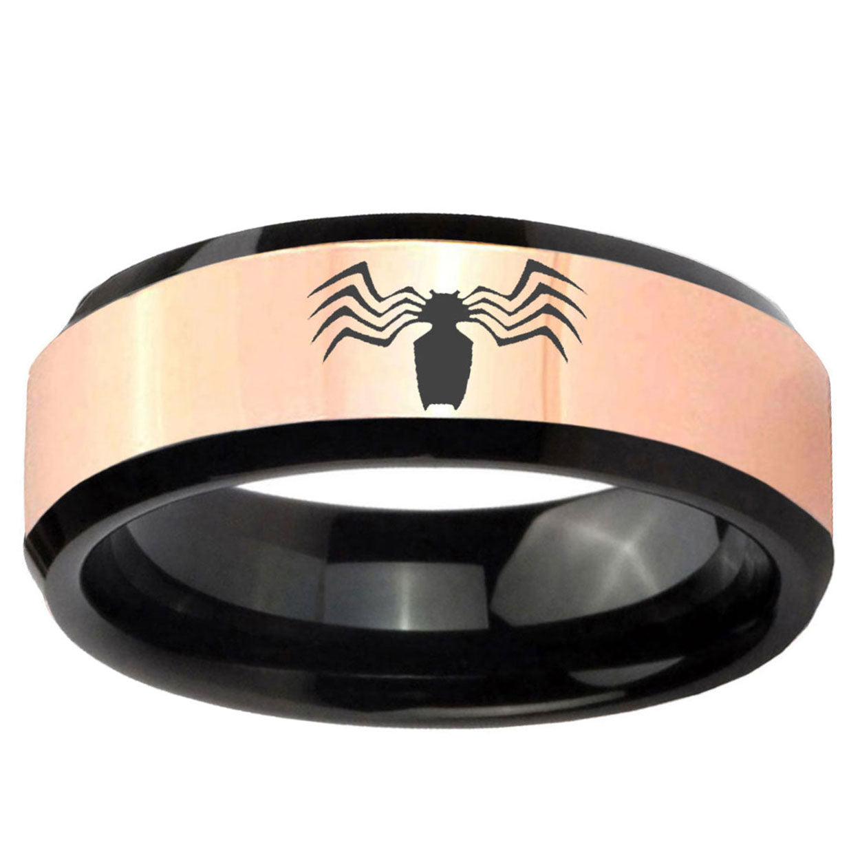 Intruding 8mm Spider Rose Gold And Black Beveled Edge Tungsten Carbide Promise Ring . Offer in men wedding band in 8mm band width rose gold black plated finished from size 7 to 14