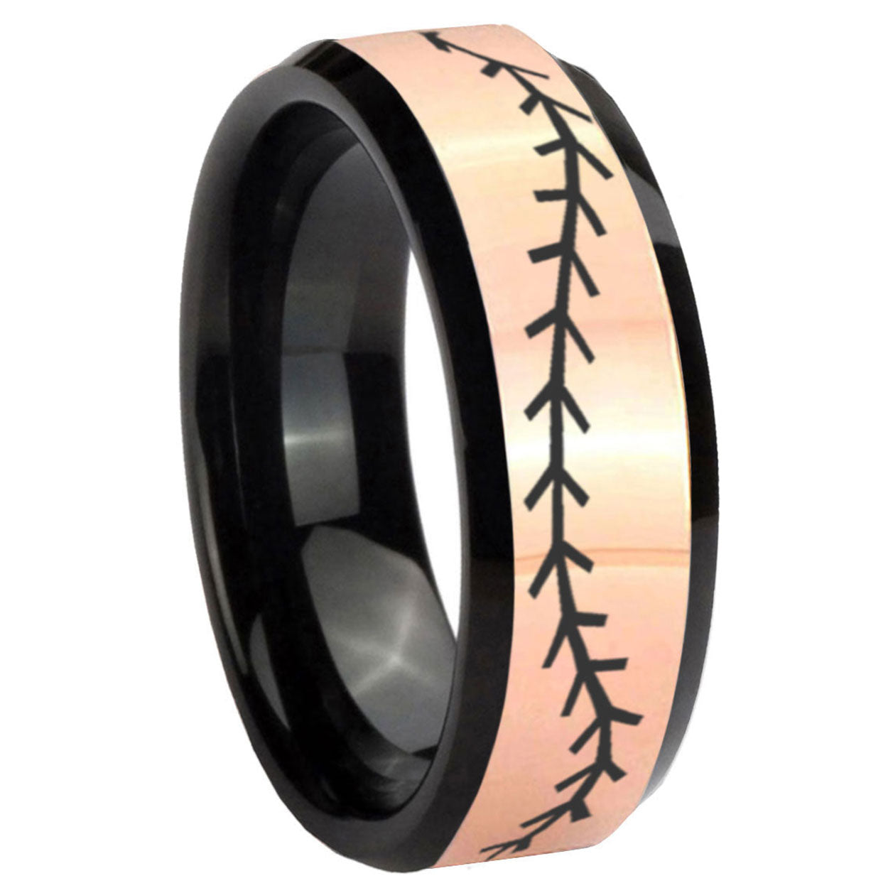 Intruding 8mm Baseball Stitch Rose Gold And Black Beveled Edge Tungsten Carbide Mens Promise Ring . Offer in men wedding band in 8mm band width rose gold black plated finished from size 7 to 14
