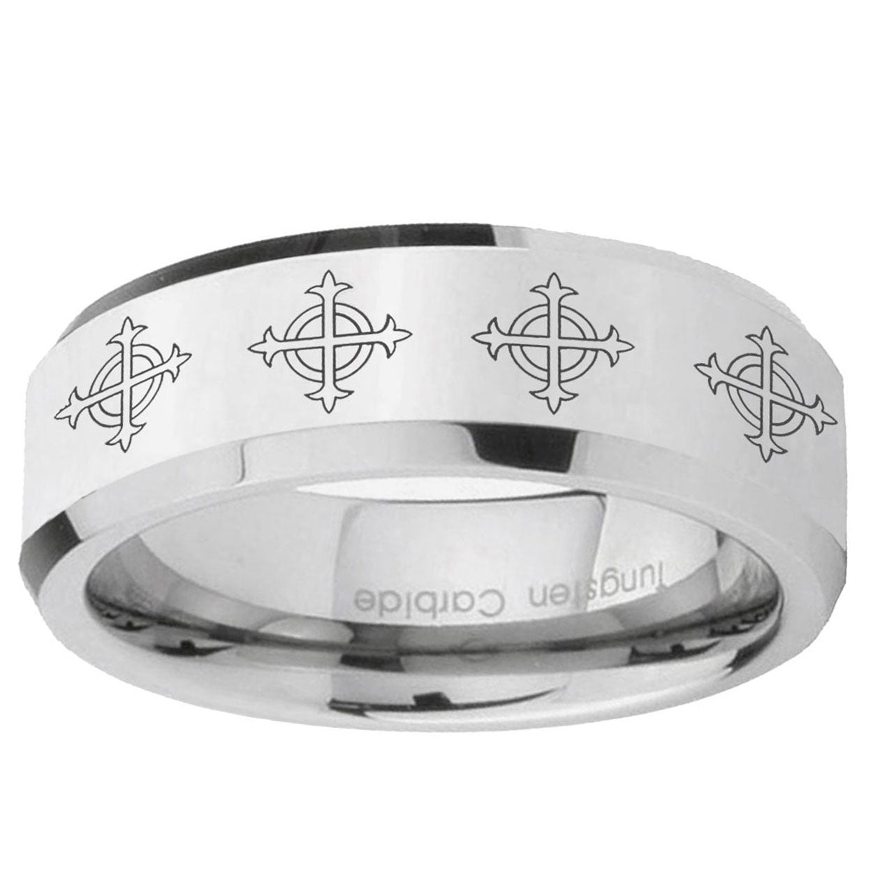 Intruding 5, 8mm Multiple Crosses Beveled Edges Silver Tungsten Carbide Mens Promise Ring . Offer in both 5mm and 8mm band width polished silver finished from size 4 to 14
