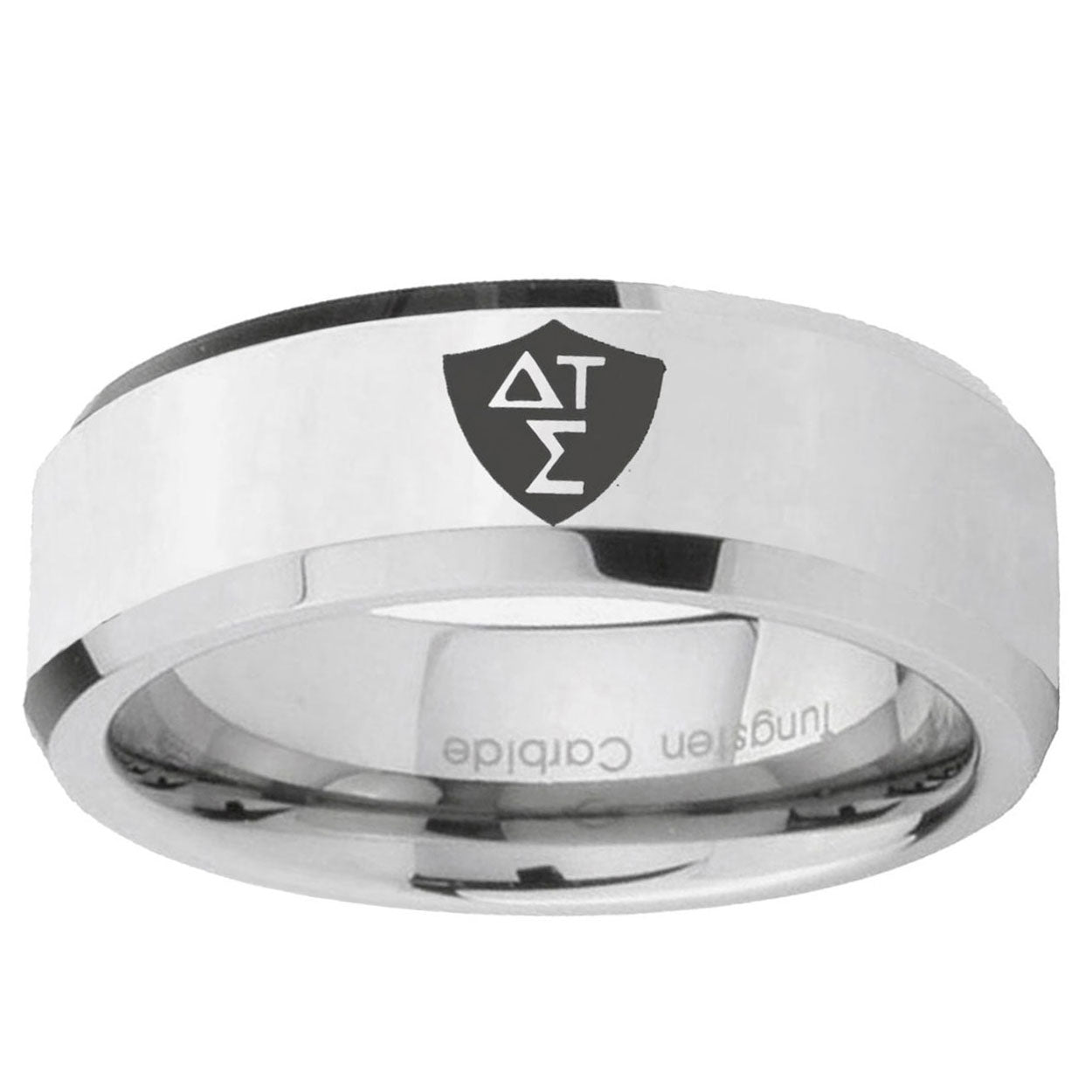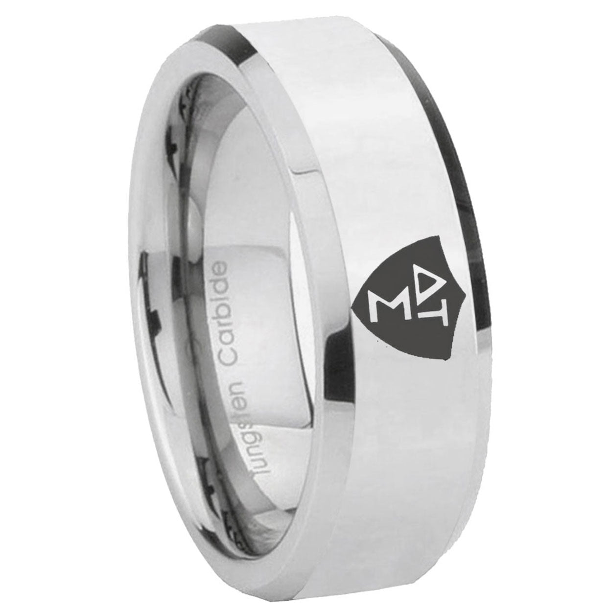 Intruding 5, 8mm Greek CTR Beveled Edges Silver Tungsten Carbide Mens Ring Engraved . Offer in both 5mm and 8mm band width polished silver finished from size 4 to 14