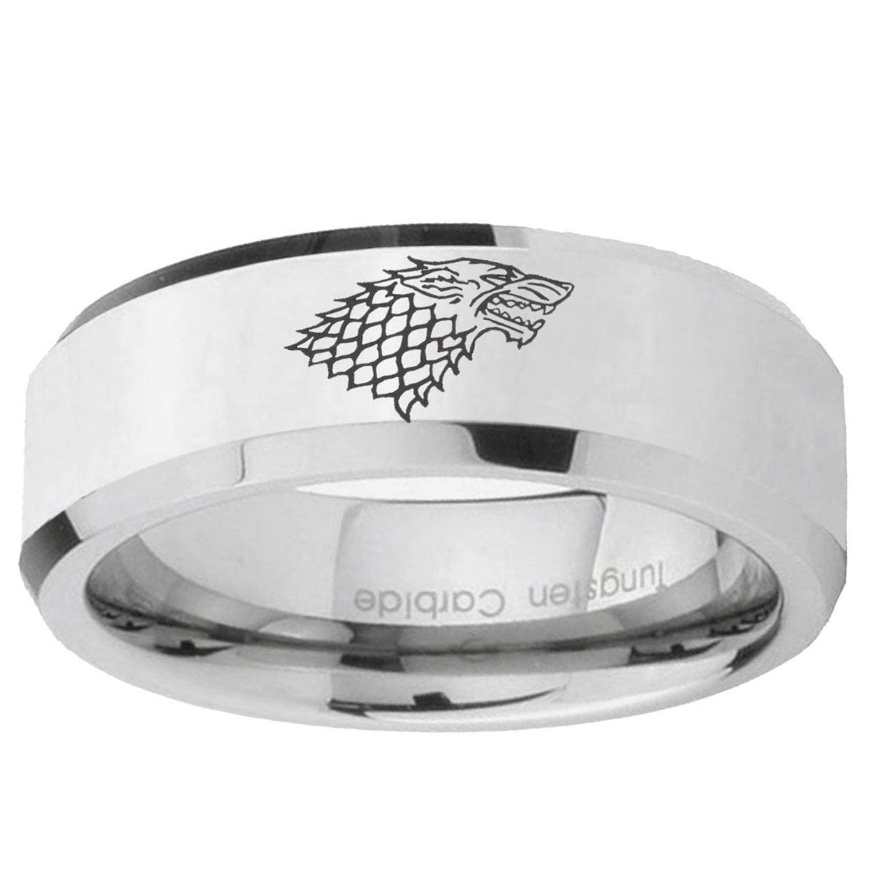 Intruding 5, 8mm Game Of Thrones House Stark Direwolf Beveled Edges Silver Tungsten Carbide Men's Band Ring . Offer in both 5mm and 8mm band width polished silver finished from size 4 to 14