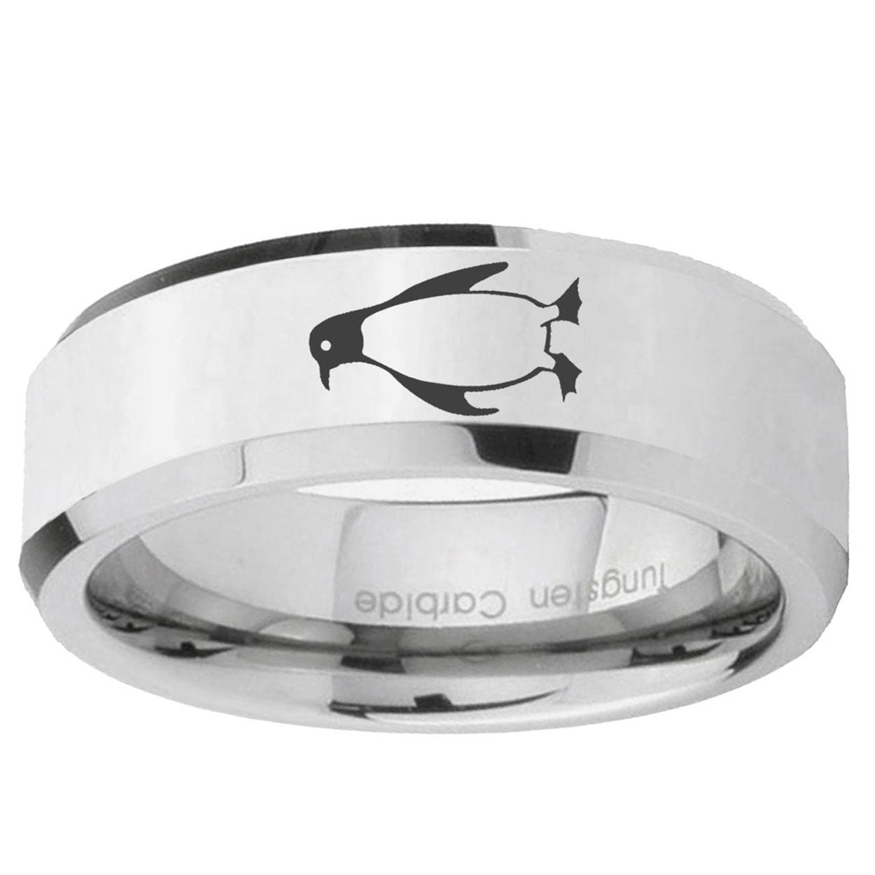 Intruding 5, 8mm Penguin Beveled Edges Silver Tungsten Carbide Men's Band Ring . Offer in both 5mm and 8mm band width polished silver finished from size 4 to 14