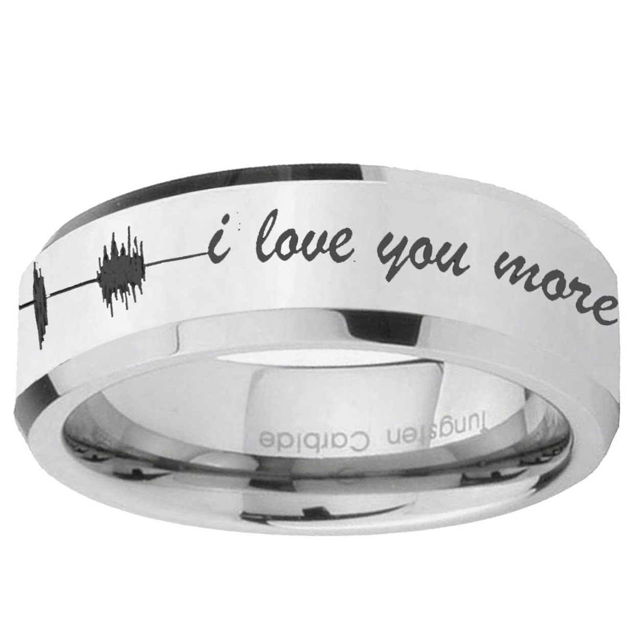 Intruding 5, 8mm Sound Wave, I love you more Beveled Silver Tungsten Men's Engagement Ring . Offer in both 5mm and 8mm band width polished silver finished from size 4 to 14