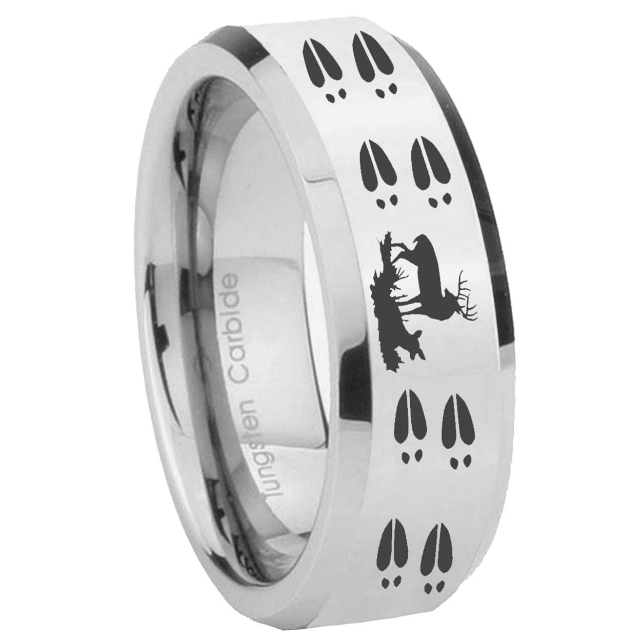 5, 8mm Deer Hunting Tracks Beveled Edges Silver Tungsten Carbide Men's Ring