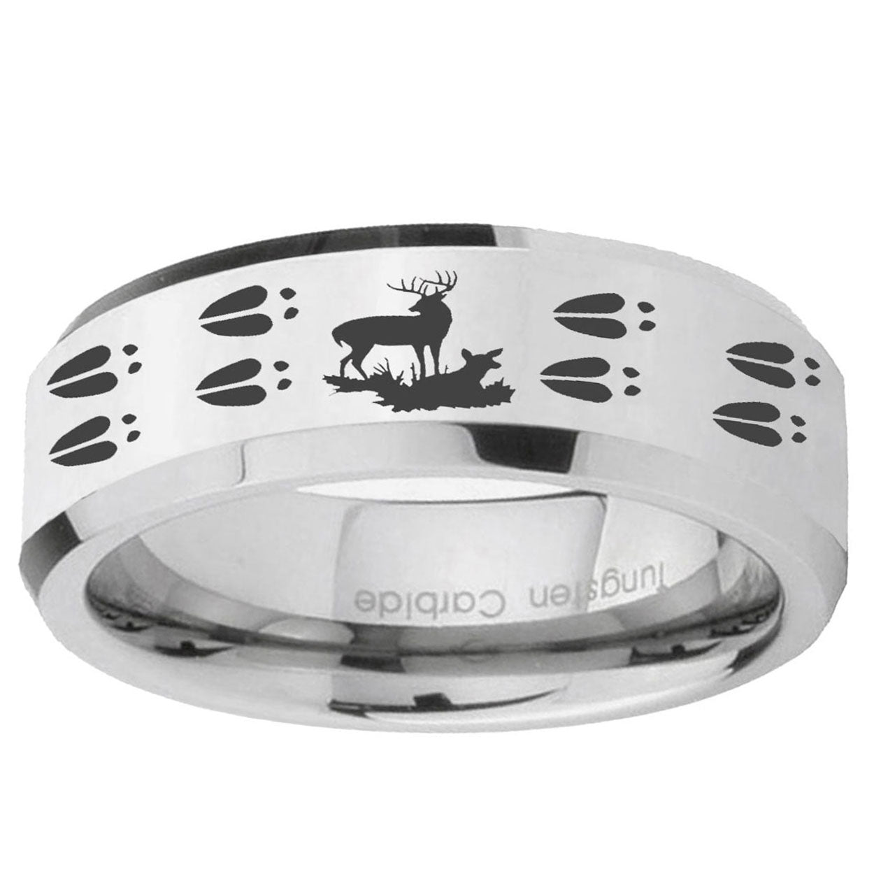 Intruding 5, 8mm Deer Hunting Tracks Beveled Edges Silver Tungsten Carbide Men's Ring . Offer in both 5mm and 8mm band width polished silver finished from size 4 to 14