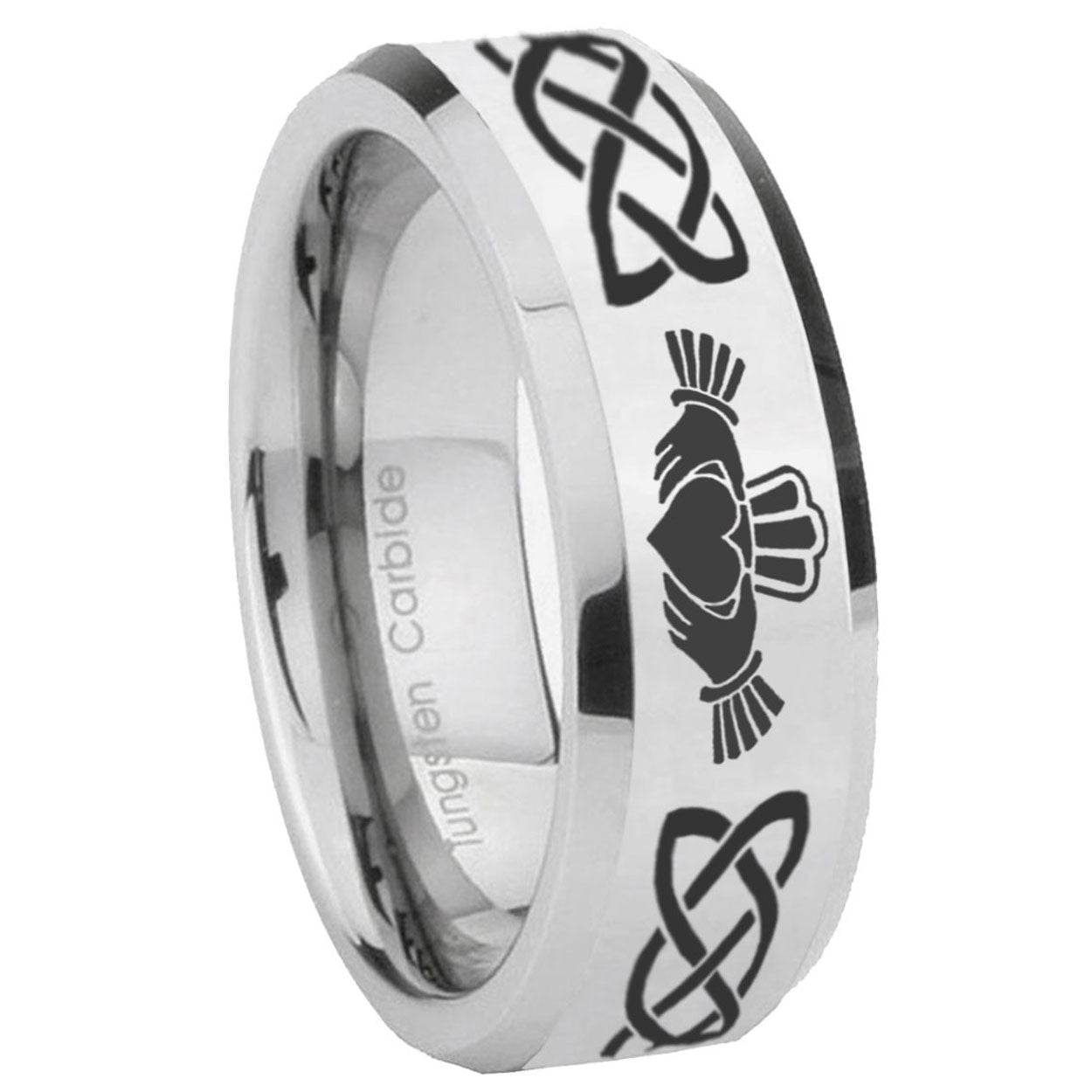 Intruding 5, 8mm Irish Claddagh Beveled Edges Silver Tungsten Carbide Men's Engagement Ring . Offer in both 5mm and 8mm band width polished silver finished from size 4 to 14