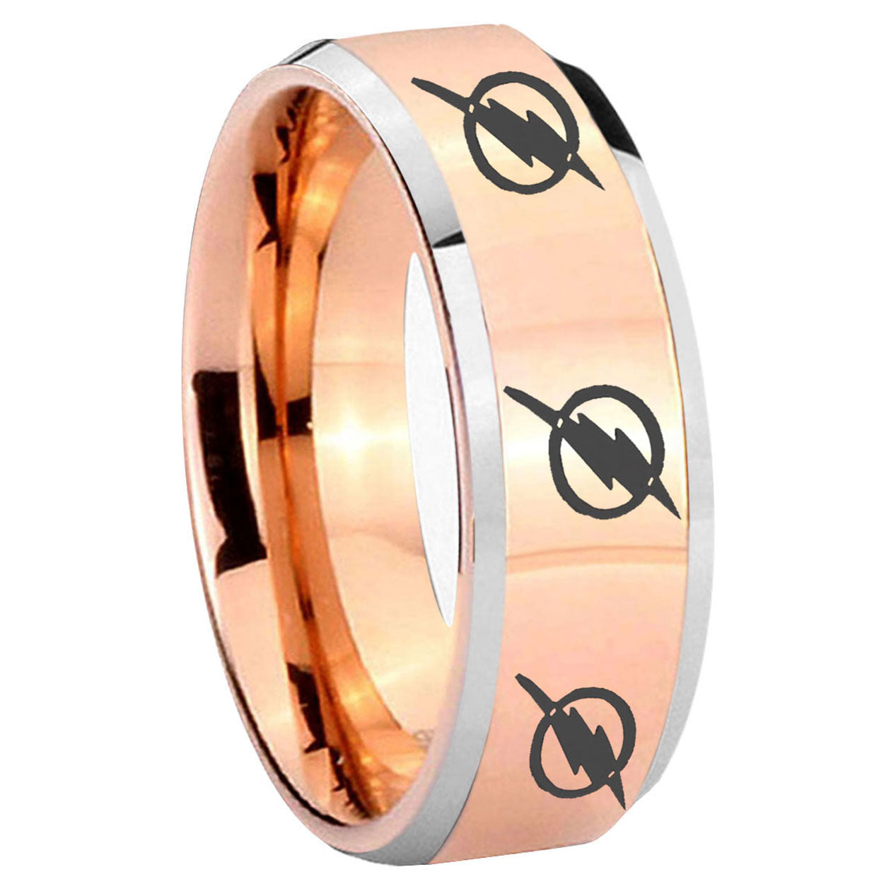 Intruding 5, 8mm Multiple Flash Beveled Edge Rose Gold Wedding Rings For Guys . Offer in both 5mm and 8mm band width rose gold two tone finished from size 4 to 14