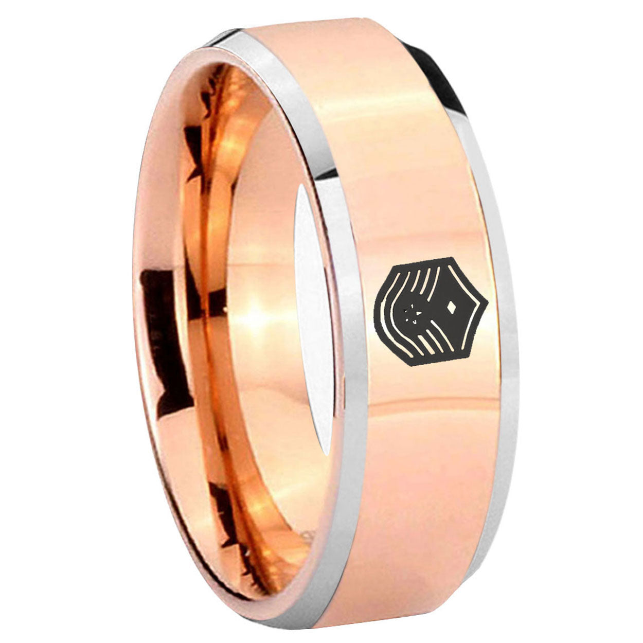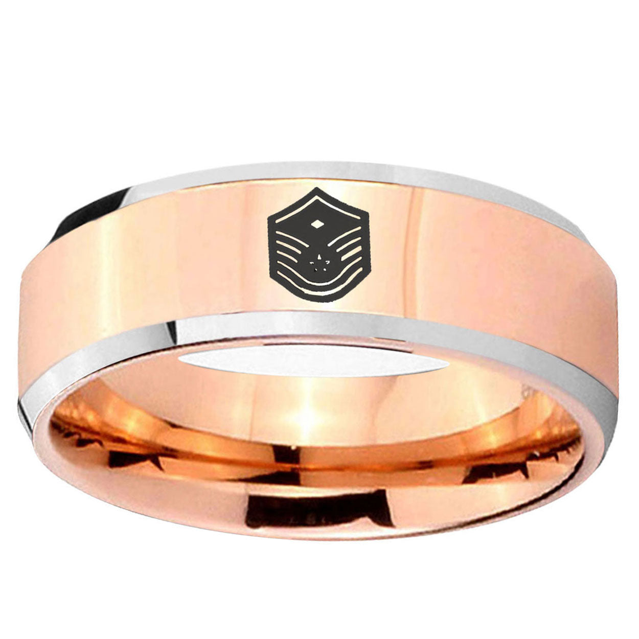 Intruding 5, 8mm Chief Master Sergeant Vector Beveled Rose Gold Tungsten Wedding Band Ring . Offer in both 5mm and 8mm band width rose gold two tone finished from size 4 to 14
