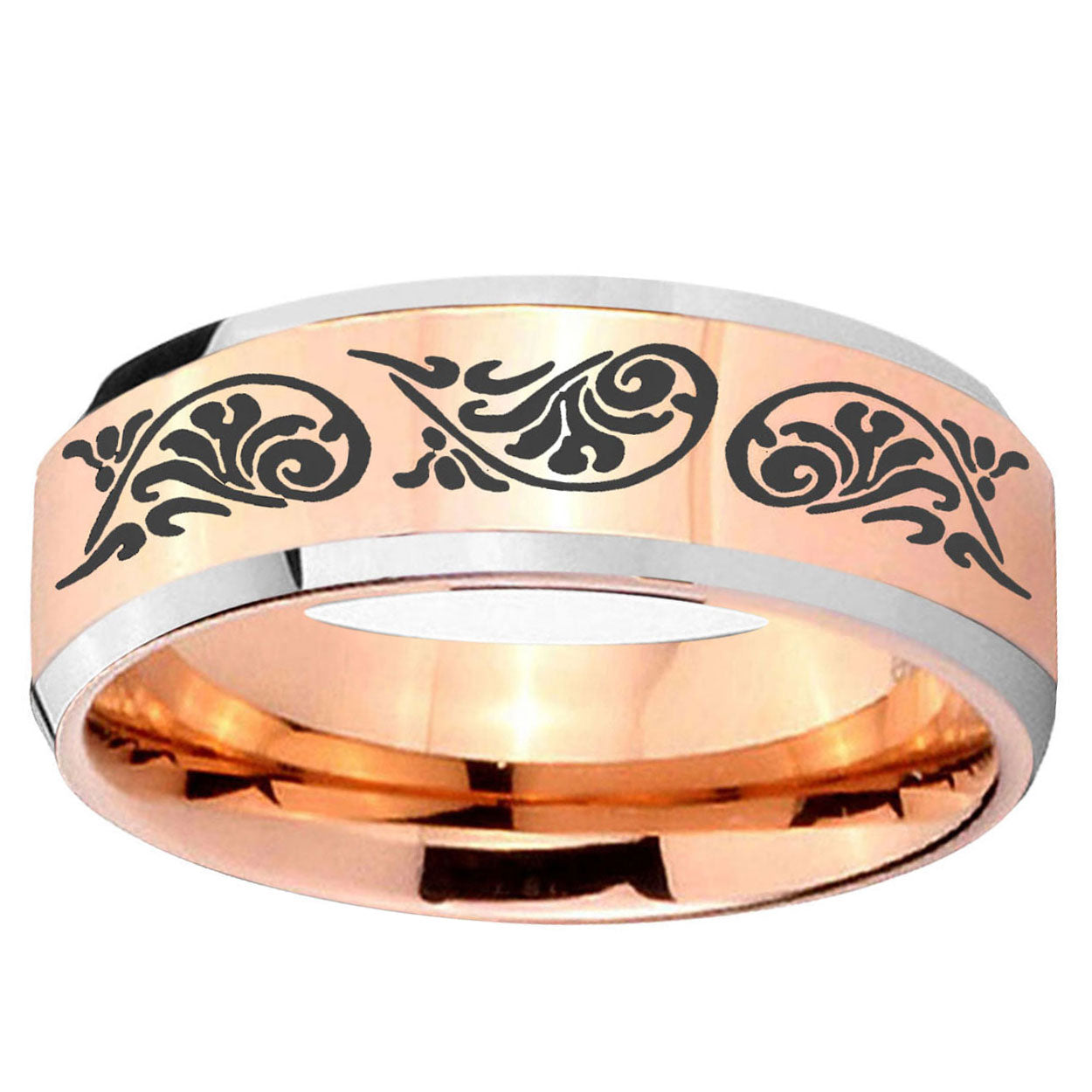 Intruding 5, 8mm Etched Tribal Pattern Beveled Edges Rose Gold Tungsten Custom Ring for Men . Offer in both 5mm and 8mm band width rose gold two tone finished from size 4 to 14