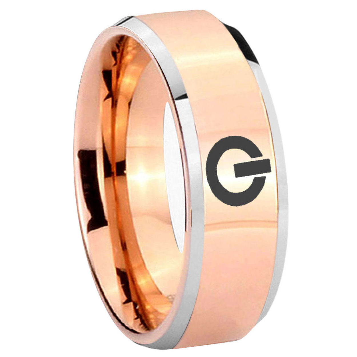 Intruding 5, 8mm Power Beveled Edges Rose Gold Tungsten Carbide Mens Wedding Ring . Offer in both 5mm and 8mm band width rose gold two tone finished from size 4 to 14
