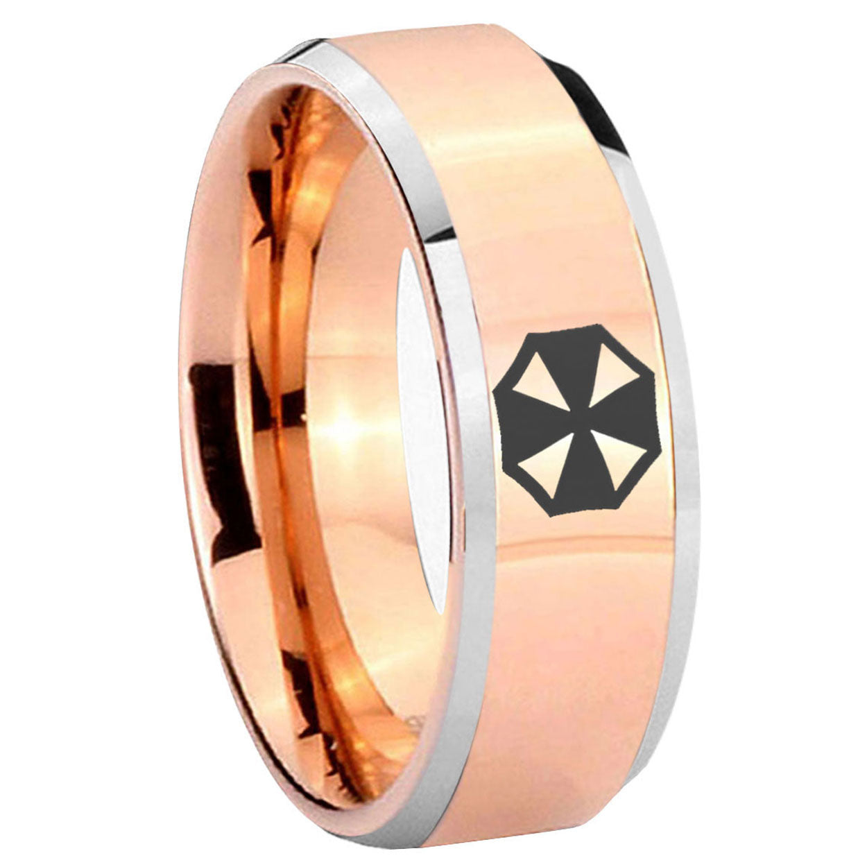 Intruding 5, 8mm Resident Evil Beveled Edges Rose Gold Tungsten Carbide Personalized Ring . Offer in both 5mm and 8mm band width rose gold two tone finished from size 4 to 14