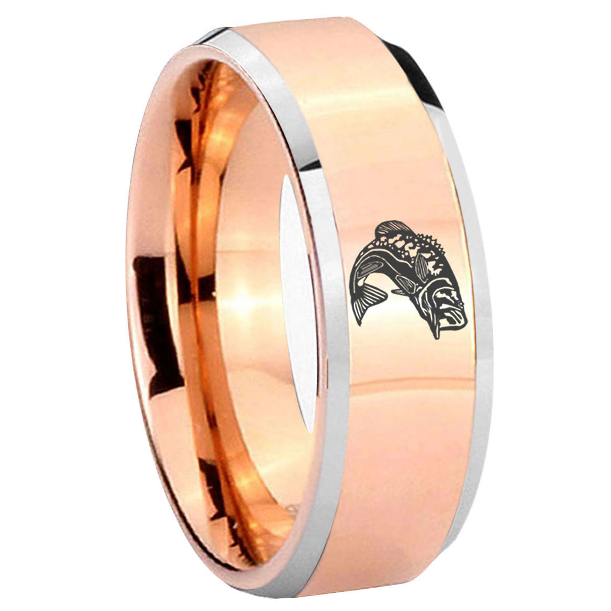Intruding 5, 8mm Fishing Beveled Edges Rose Gold Tungsten Carbide Men's Ring . Offer in both 5mm and 8mm band width rose gold two tone finished from size 4 to 14