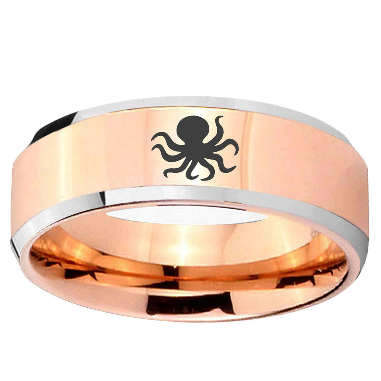 Intruding 5, 8mm Octopus Beveled Edges Rose Gold Tungsten Carbide Men's Ring . Offer in both 5mm and 8mm band width rose gold two tone finished from size 4 to 14