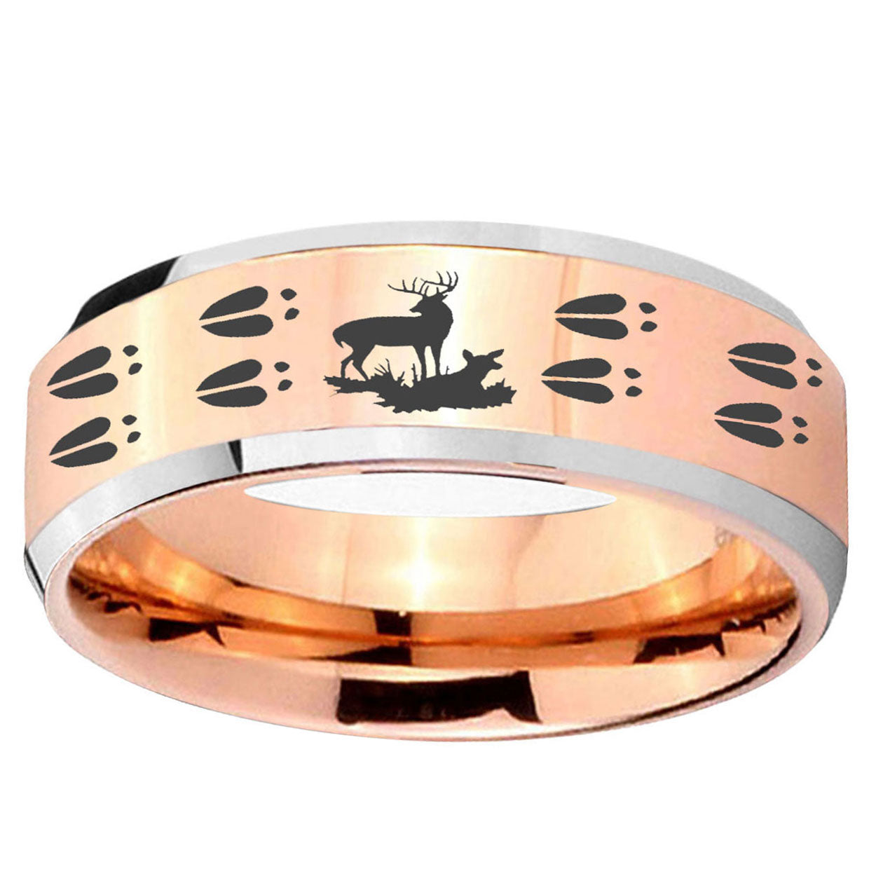 Intruding 5, 8mm Deer Hunting Tracks Beveled Edges Rose Gold Tungsten Wedding Band Mens . Offer in both 5mm and 8mm band width rose gold two tone finished from size 4 to 14