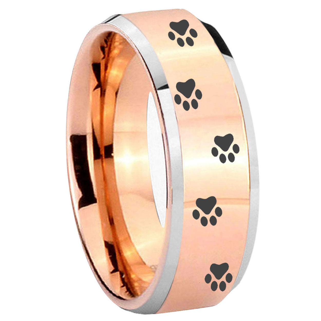 Intruding 5, 8mm Paw Print Beveled Edges Rose Gold Tungsten Carbide Wedding Bands Ring . Offer in both 5mm and 8mm band width rose gold two tone finished from size 4 to 14