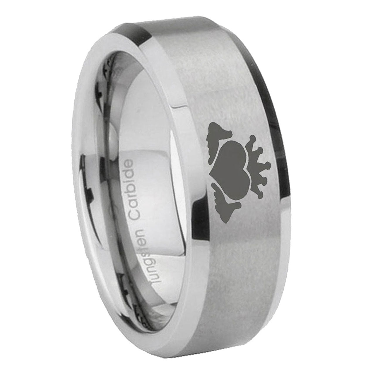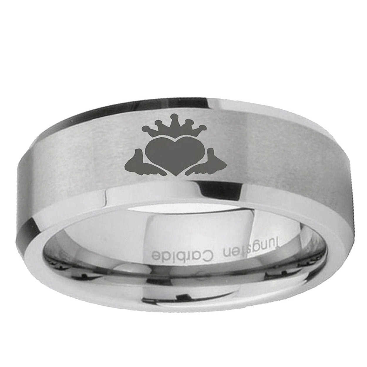 Introducing 6, 8mm Claddagh Design Beveled Edge Brushed Grey Tungsten Rings for Men . Offer in both 6mm and 8mm band width brushed grey finished from size 5 to 14